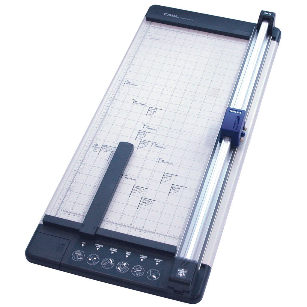 This versatile trimmer has applications in both the commercial and craft markets: 20 sheet a2 trimmer Cuts onto a replaceable cutting mat positioned beneath blade Cutting length of 653mm Spare straight and perforating blade included Standard size paper markings for easy use when cutting A magnetic paper guide is also provided Spare part: 799250, 799002, 799003