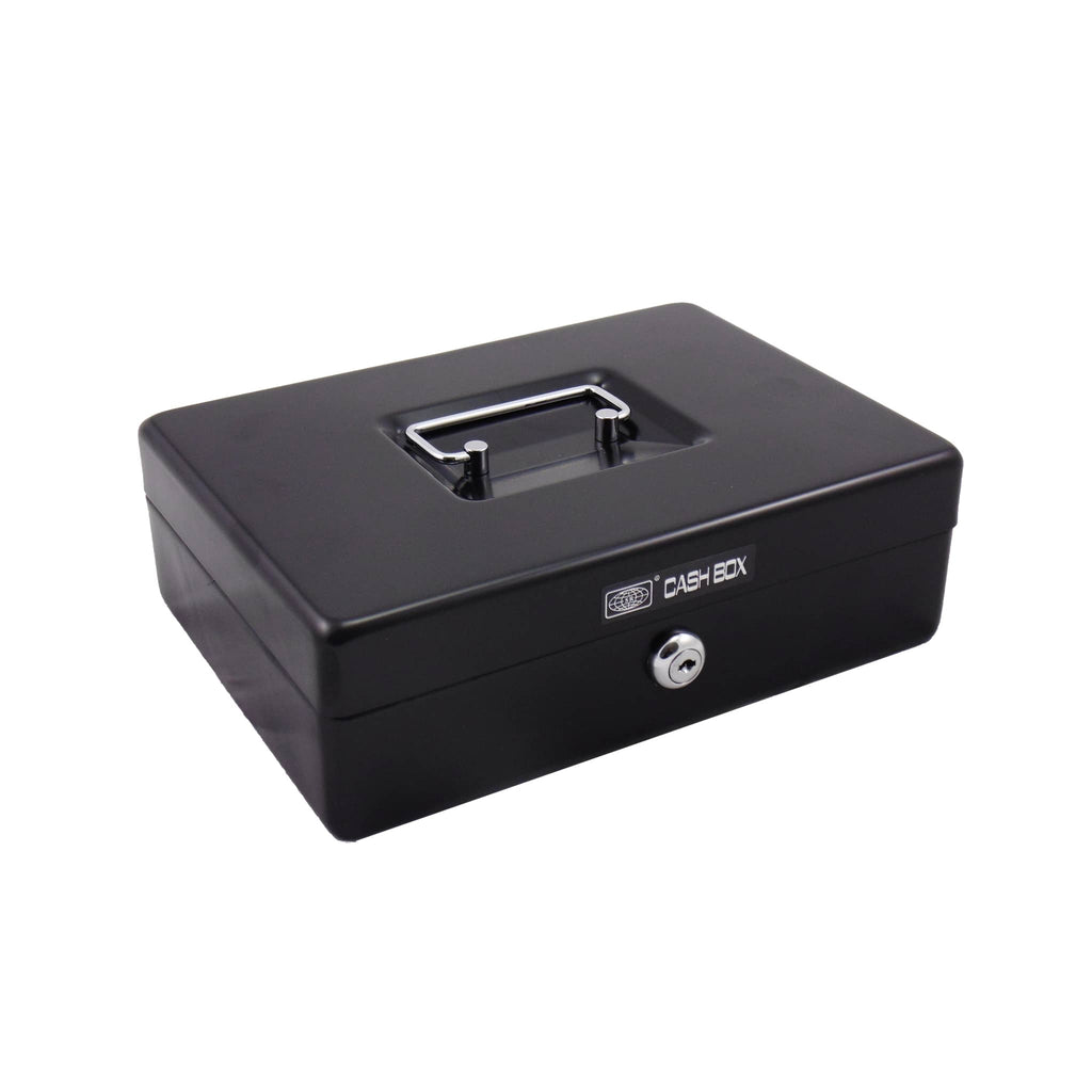 • 250 x 180 x 80mm • strong metal 10 inch cash box for secure storage of cash, valuables, and important documents • includes removable plastic insert tray with space beneath for bank notes and other papers • recessed handle folds away neatly for storage and stacking • supplied with 2 keys