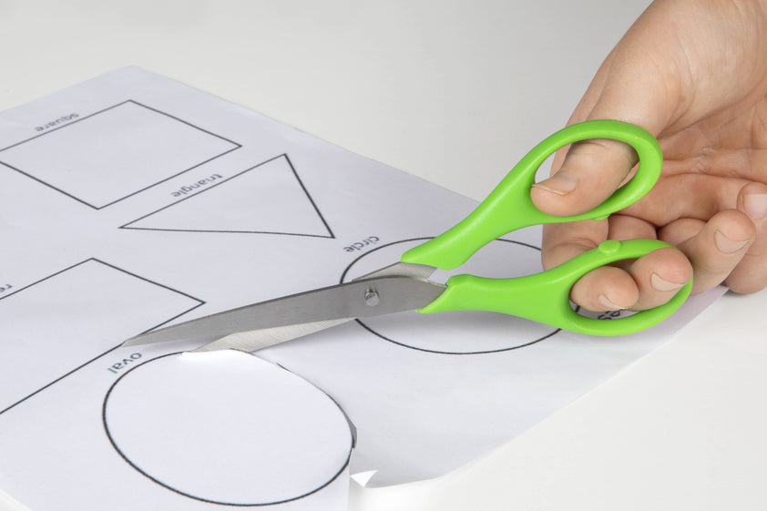 Designed for students, these scissors feature a stainless steel blade and comfortable Green left hand plastic handle.
