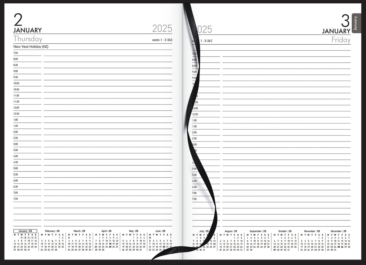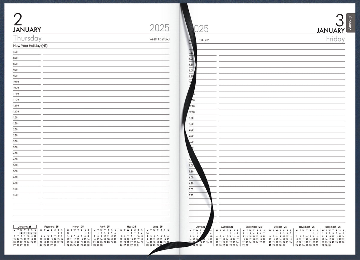 A51A Appointment. A5 portrait. 1 day per page, 1/2 hour appointments 7.30am-7.30pm. Cash summary. Ribbon marker. Sewn, hard cover, book cloth cover.