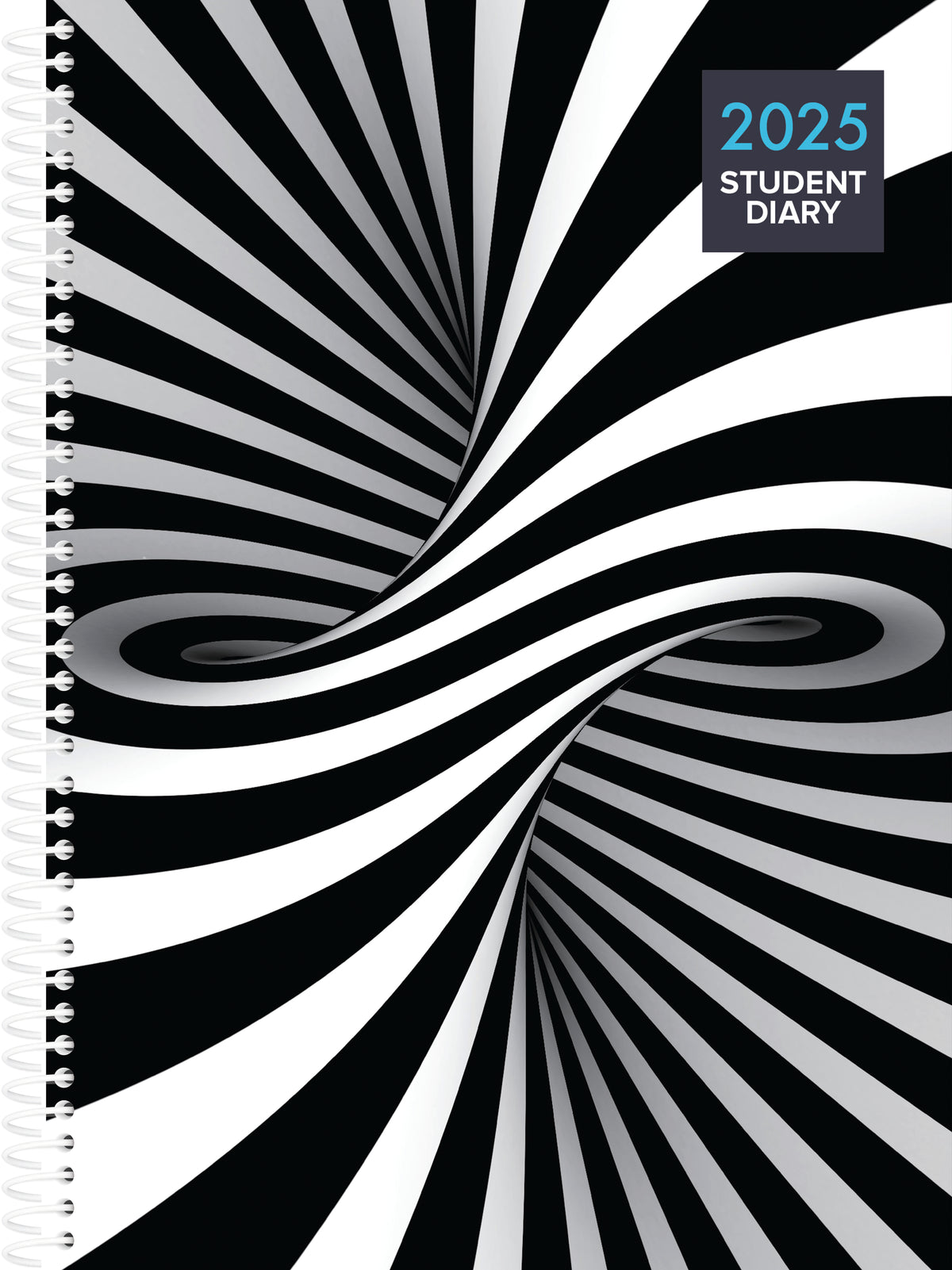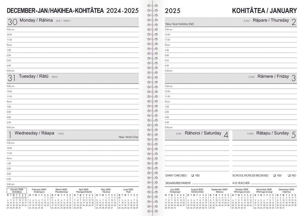 Week to view. School timetable, sports/activities, assignments. Spiral bound, flexible, polyprop with laminated cover behind.