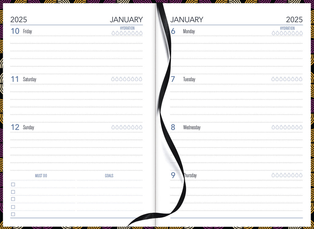 148x105mm. Week to View. Ribbon marker & elastic. Sewn, hard cover, printed and laminated. Cover will be randomly picked. FSC Certified.