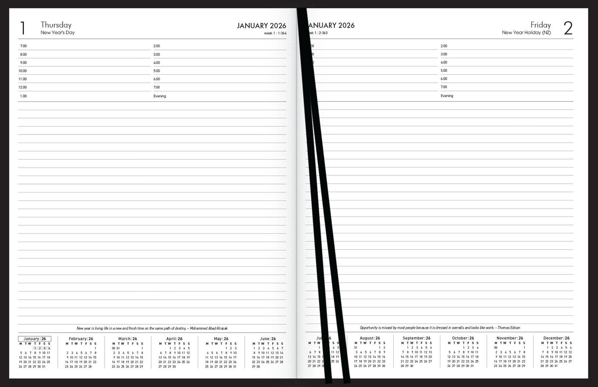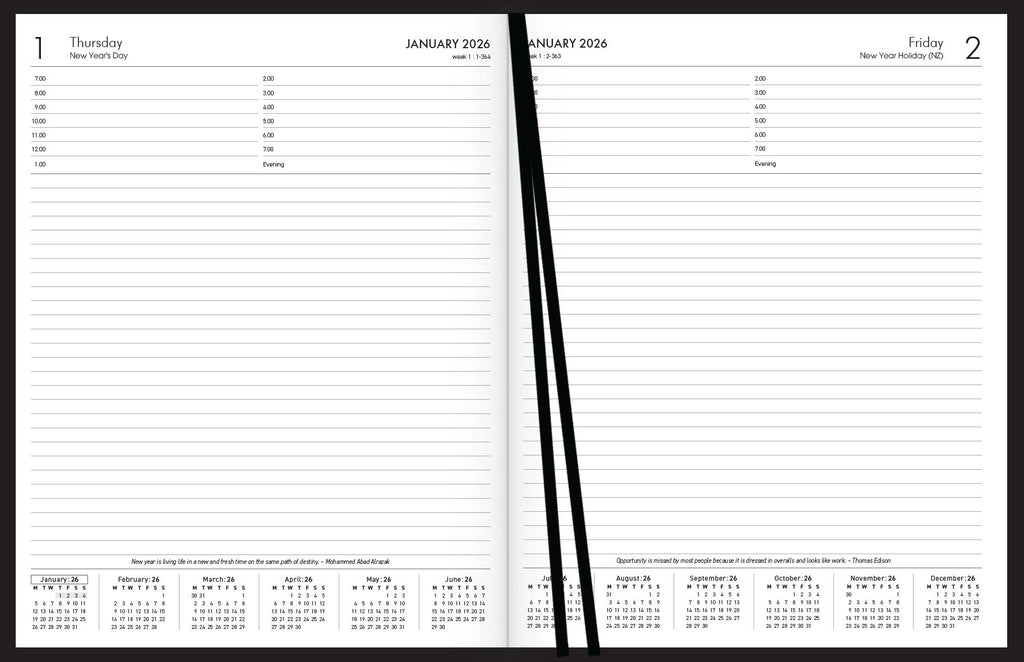 260x208mm portrait. Day to view, 1 hour appointments 7am-7pm. World/NZ maps. Twin ribbon marker.Sewn, firm, padded PU cover, edge stitching.