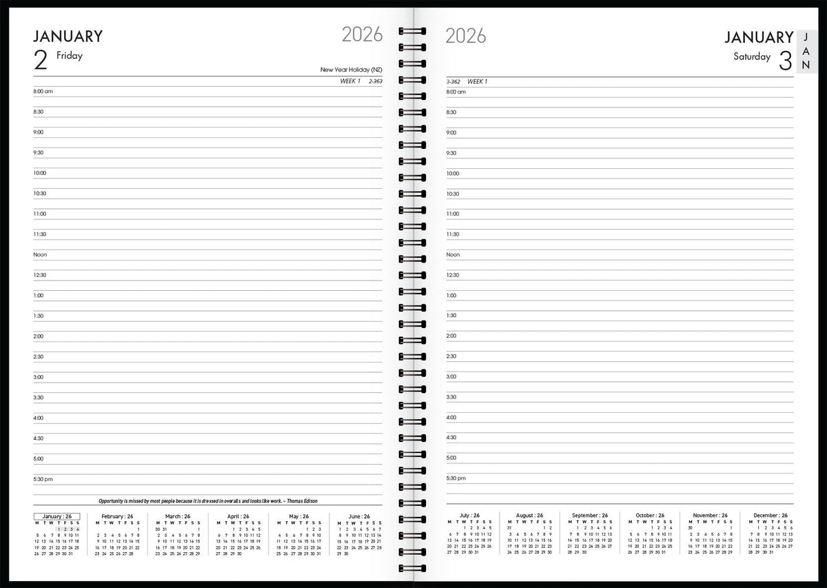 Day to view. 1/2 hourly appointments 8am-5.30pm. Hidden double wiro binding. Tora PVC covers with stitched edging. Cream pages.