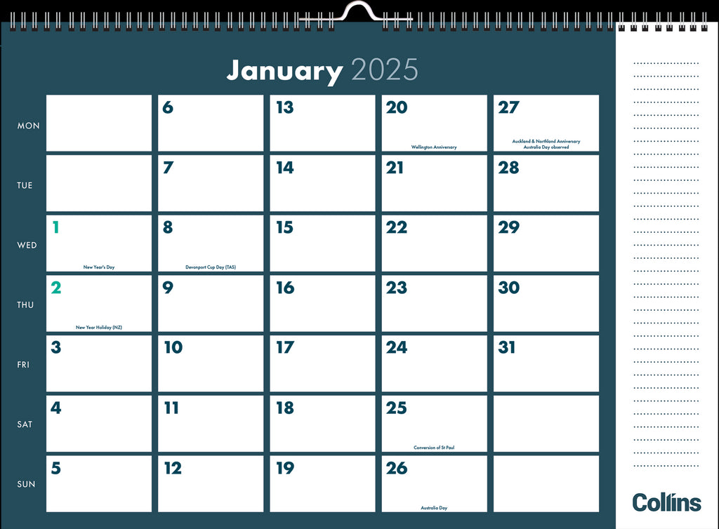Colplan Wall Calendar 420x295mm landscape. 1 month to view. Wiro bound at head, flexible.