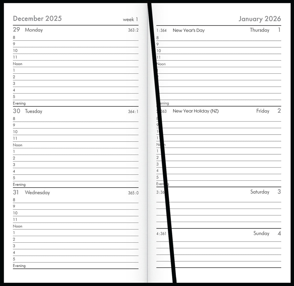 152x80mm. Week to view, 1 hour appointments 8am-5pm. Ribbon marker. Sewn, firm, padded PU cover, edge stitching.