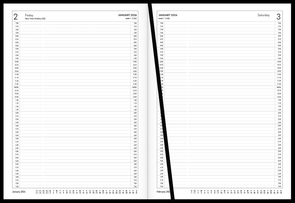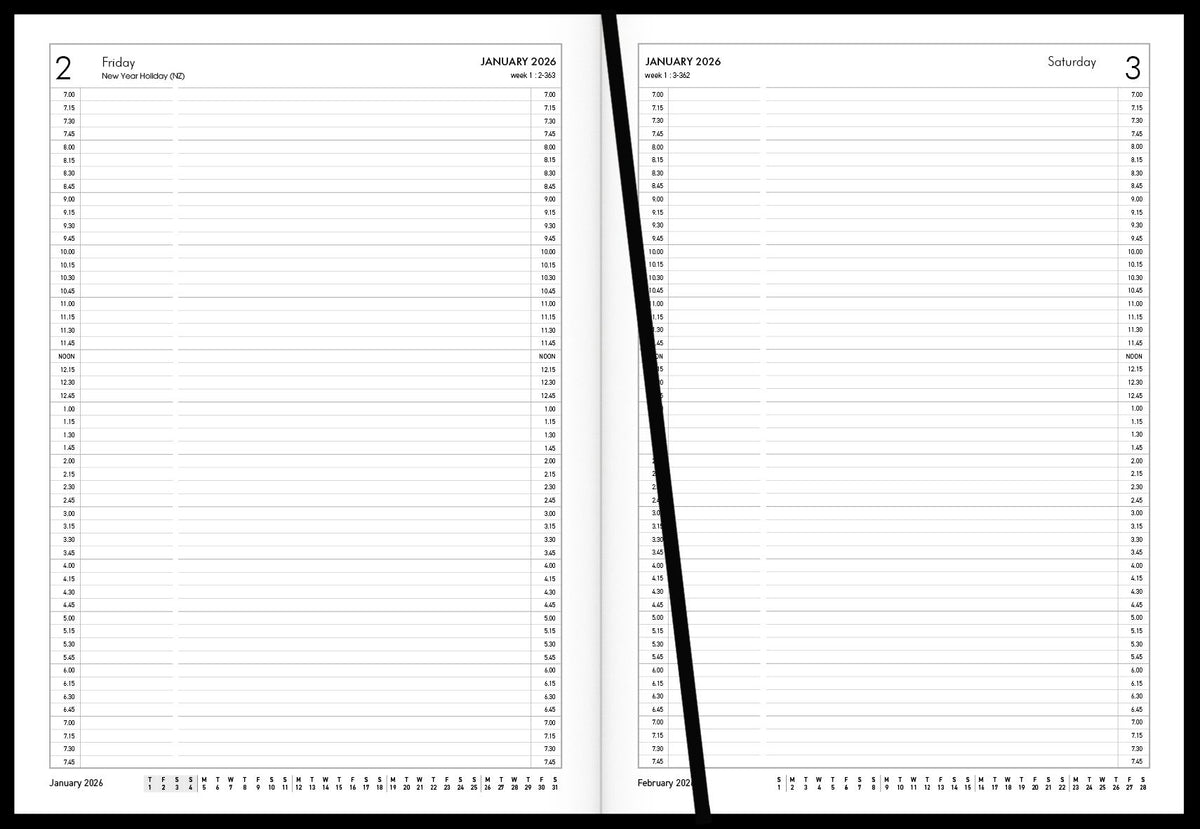 Day to view, full day Sat/Sun, 1/4 hour appointments 7am-7.45pm. Cash summary. Ribbon marker. Sewn, hard cover, book cloth cover.