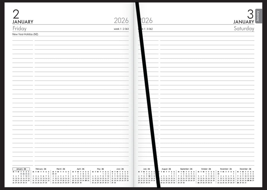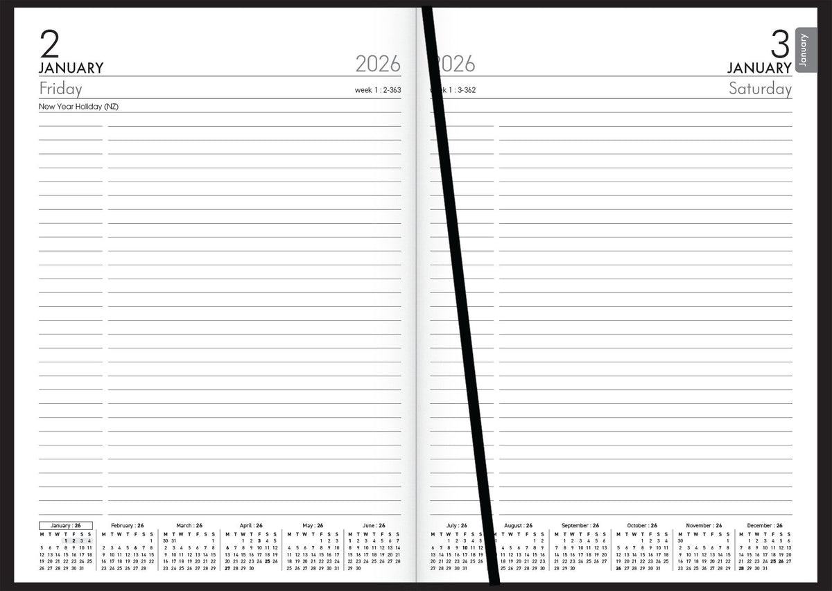A51P A5 portrait. Day per page, full day Sat/Sun. Ribbon marker. Sewn, limp, PVC cover.