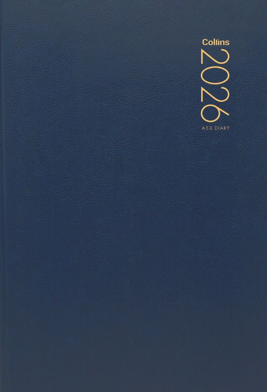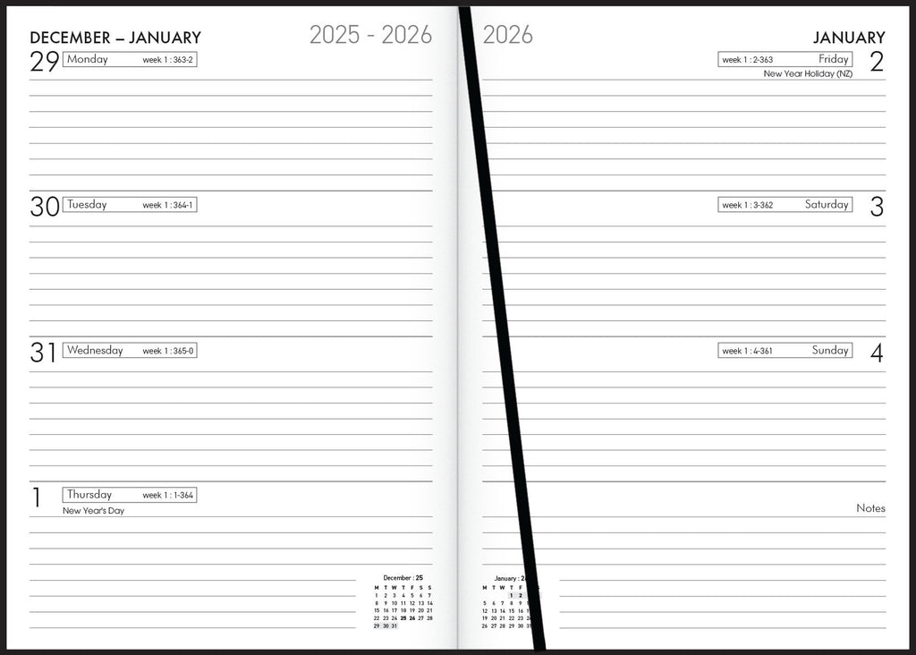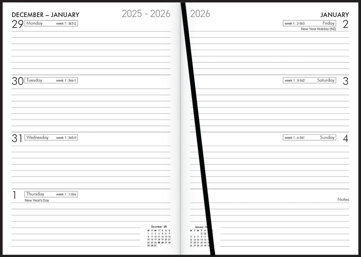 Week to view. Ribbon marker. Sewn, hard cover, book cloth cover.
