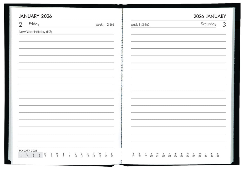 105x74mm. Day to view, full day Sat/Sun. Adhesive bound, firm, book cloth cover.