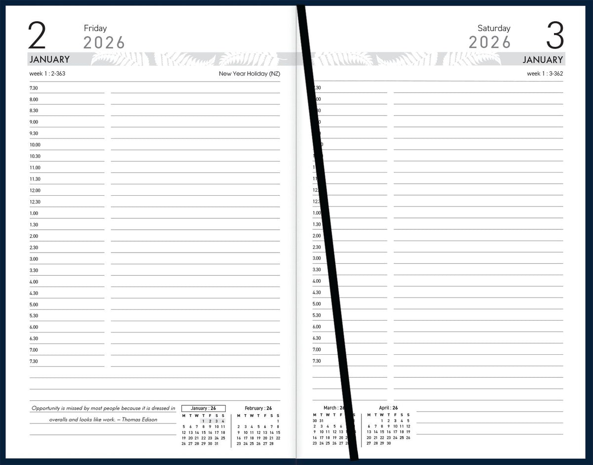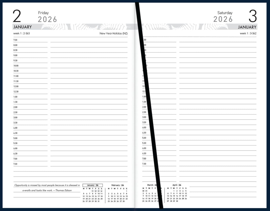 195x125mm. Day to view, full day Sat/Sun, 1/2 hour appointments 7.30am-7.30pm. Daily quotations. Ribbon marker. Sewn, flexible, PVC cover.