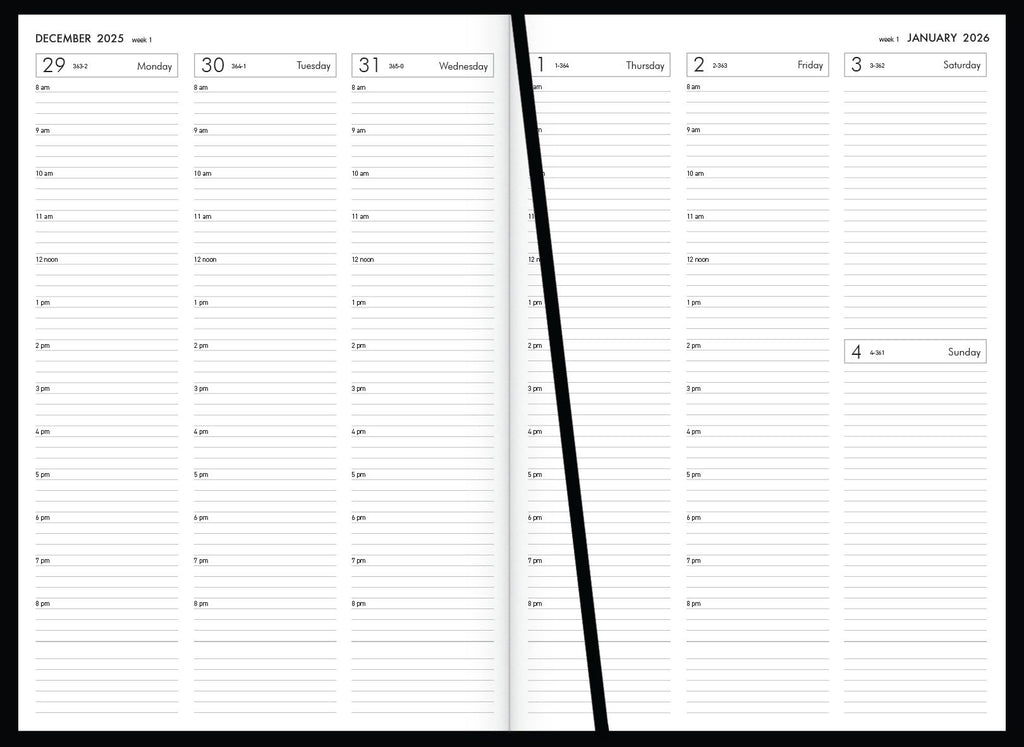 Week to view, 1 hour appointments 8am-8pm. Ribbon marker. Sewn, hard cover, book cloth cover.