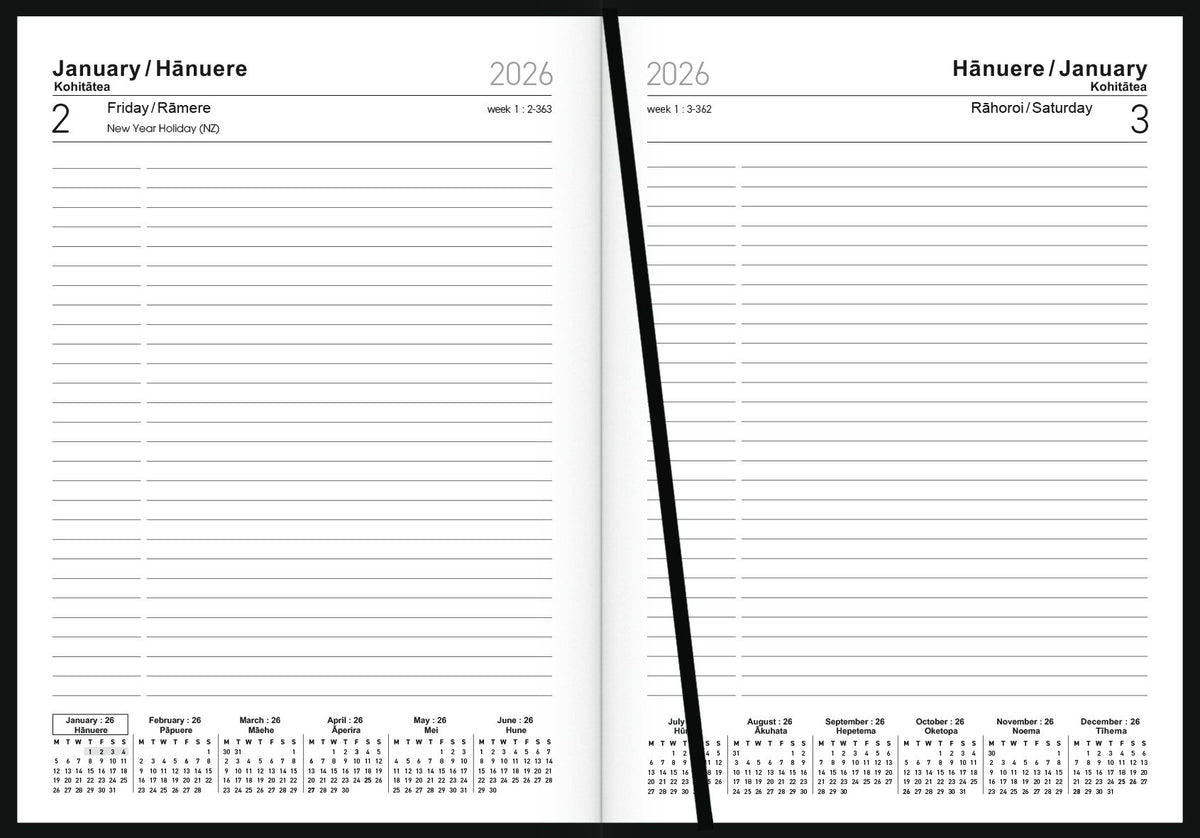 Day to view, full day Sat/Sun. Ribbon marker. Sewn, hard cover, book cloth cover.