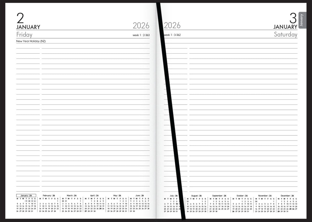 Farming information. A5 portrait. Ribbon marker. Sewn, hard cover, book cloth cover. Includes New Zealand holidays, 3 year reference calendars, phases of the moon, sunrise/sunset times, monthly livestock summary, monthly planners, tax guide, monthly cash accounts, budget for the year, rainfall record, dog medication, weed and pest chemicals, sowing record, feed grown, new grass/lucerne, cash crops, hay and silage, topdressing, contract work, weed/pest control and irrigation and comprehensive recording charts for sheep, cattle, deer, goats and more. Also includes a comprehensive list of producer boards.