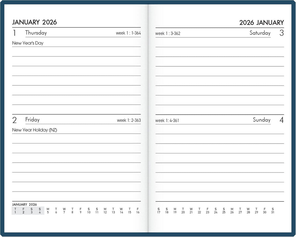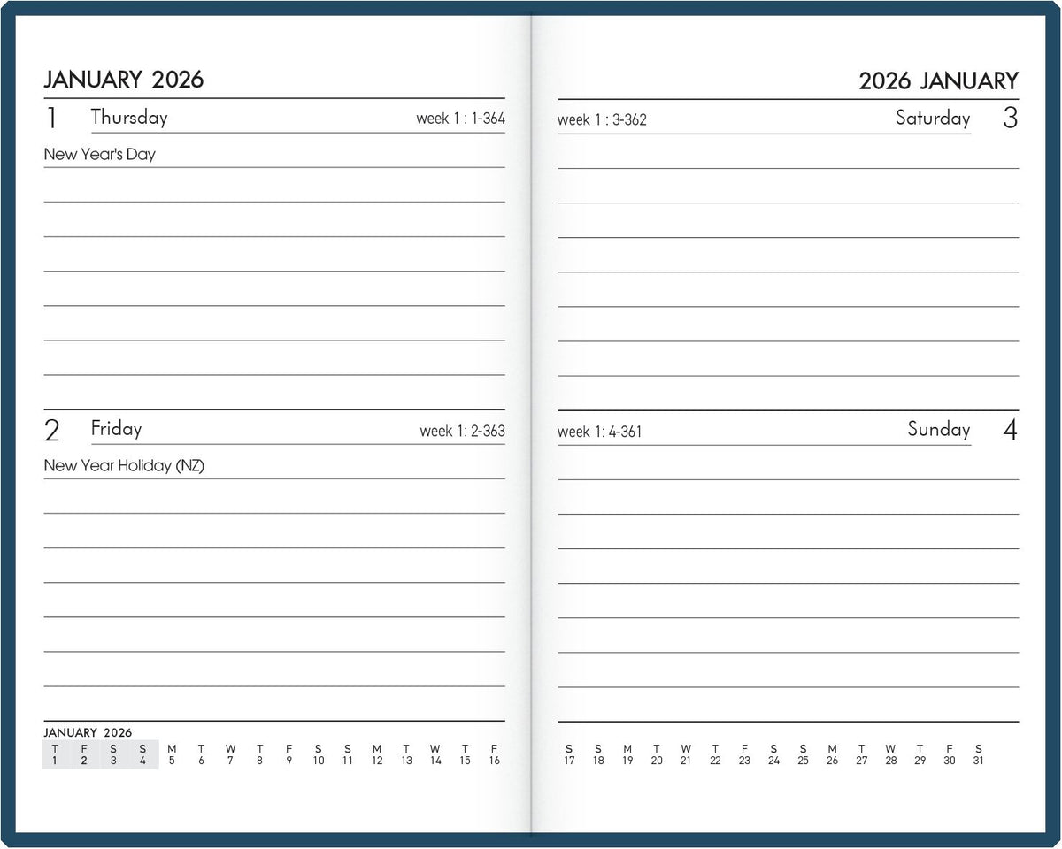 A72 pocket Diary 105x74mm. 2 days to view. Adhesive bound, limp, PCV cover. FSC certified.