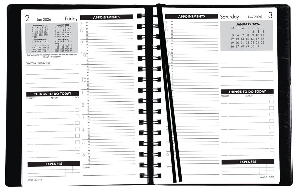Day to view, 1/4 hour appointments 7.30am-6.45pm. Things to do and quotations on every weekday page. Twin ribbon marker.Wiro bound, firm, PVC slip case cover.