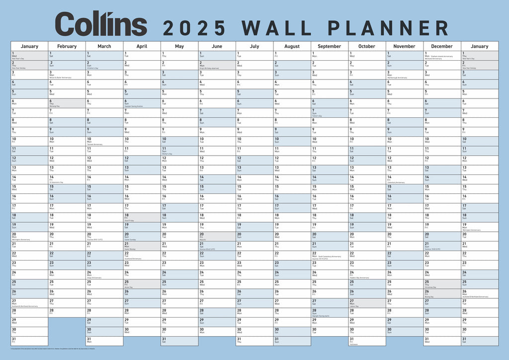 13 months to view. Double-sided: one with months along the top and days down the side, the other with days along the top and months down the side. 250gsm board. FSC certified.