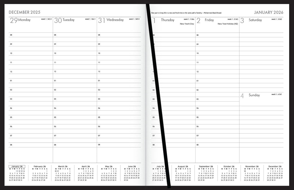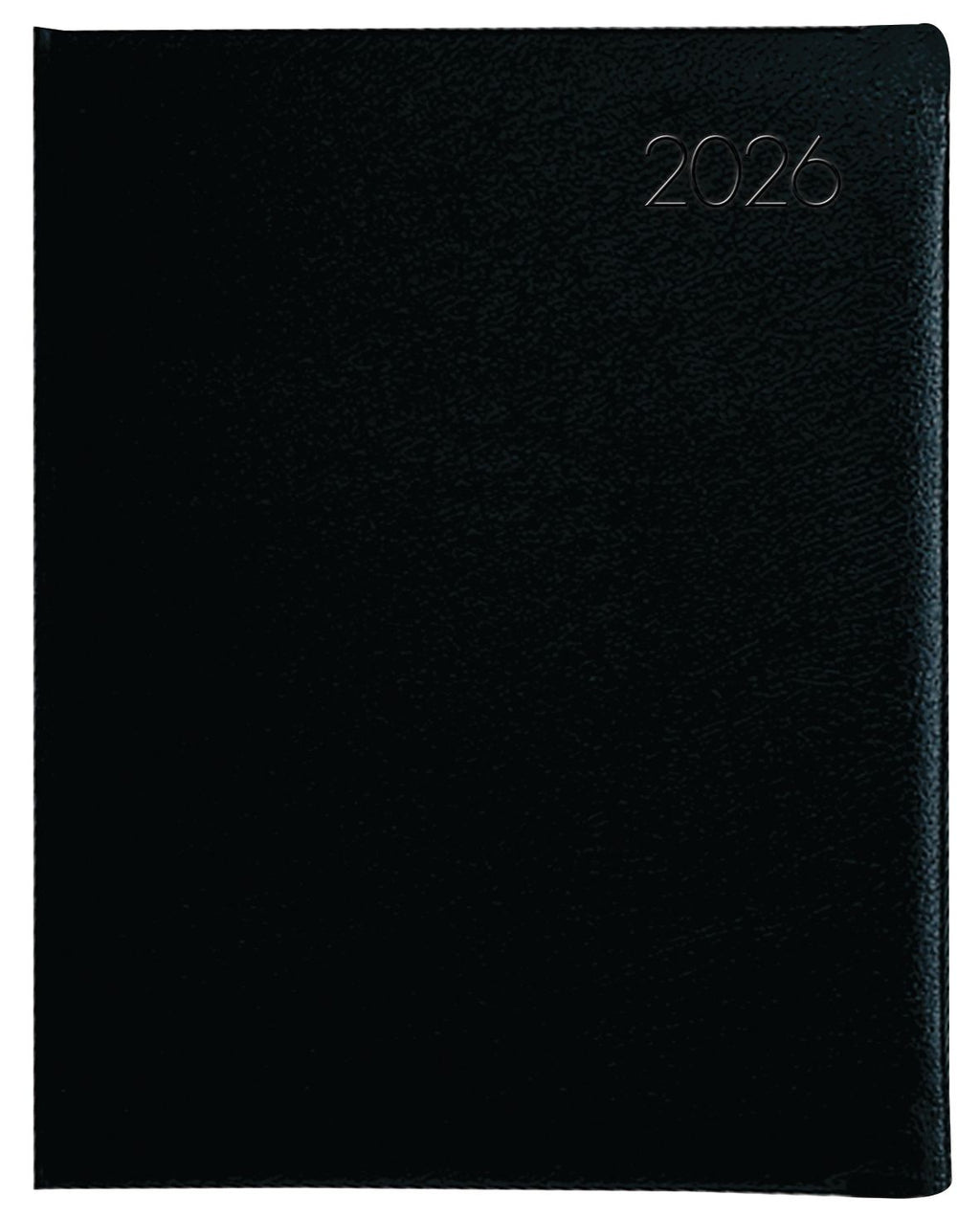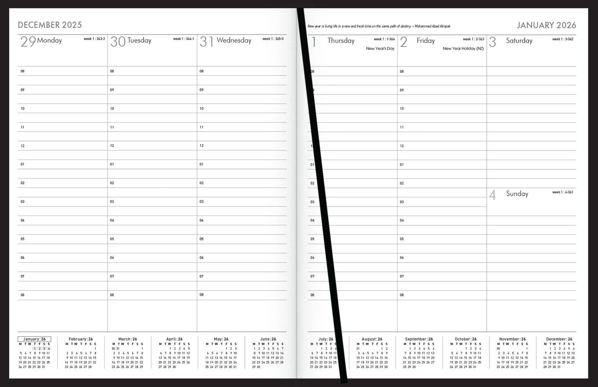 MD1083 Appointment Black FSC. 260x208mm portrait. 1 week per opening, 1 hour appointments 8am-8pm. World/NZ maps. Ribbon marker. Sewn, firm, padded PU cover, edge stitching. Vertical layout.