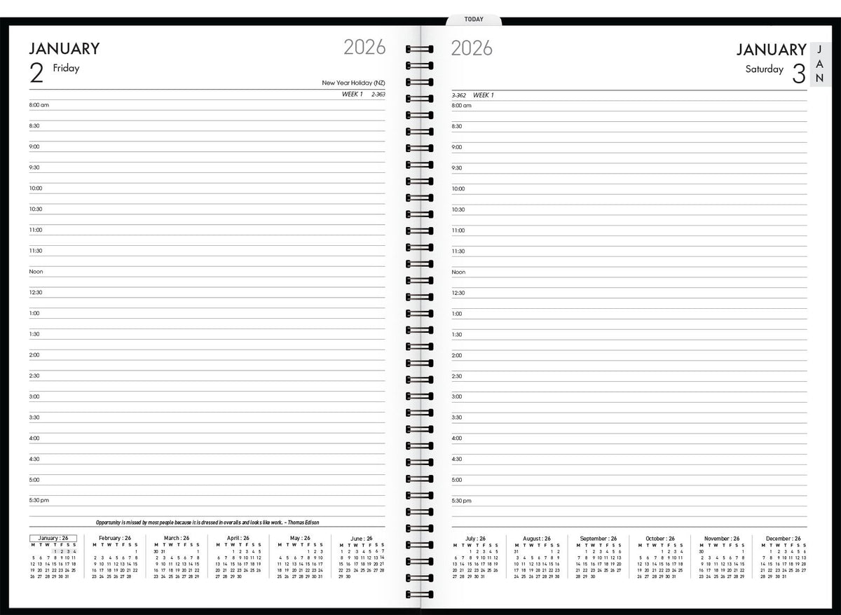 Day to view. 1/2 hourly appointments 7am-7pm. Nebraska Cowhide. PU cover. Hidden two-part black wiro binding.Cream paper. Includes today ruler and pen loop.