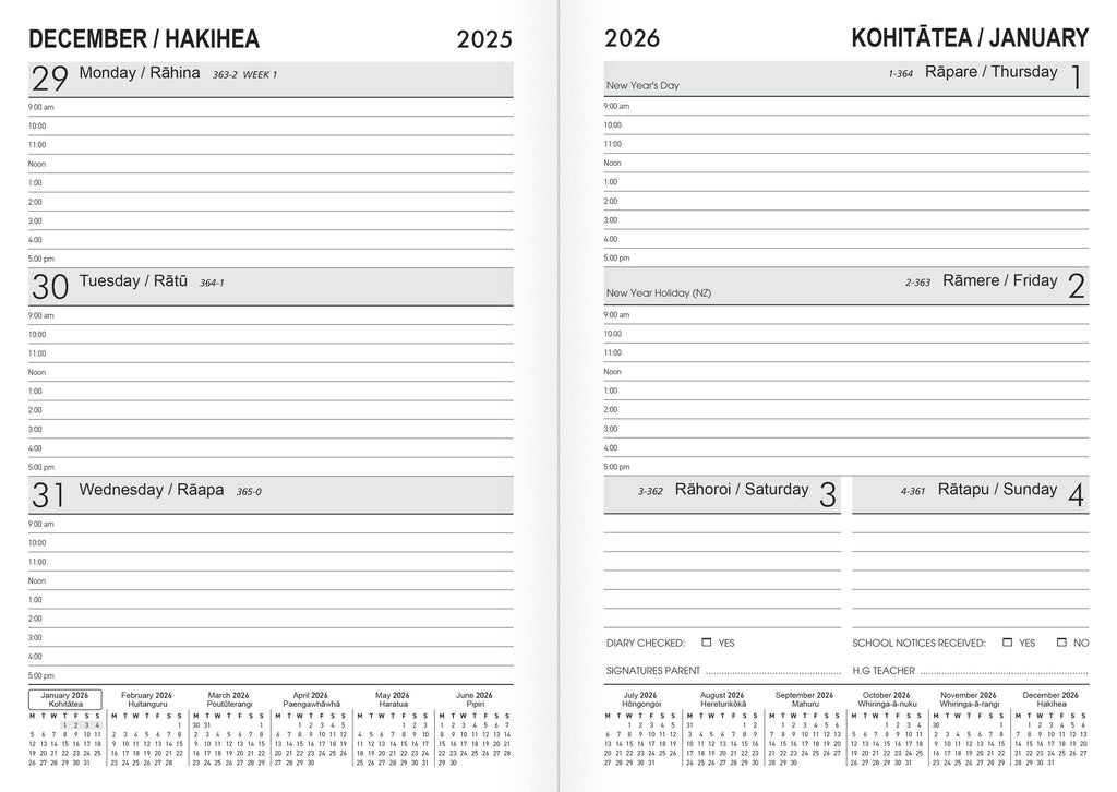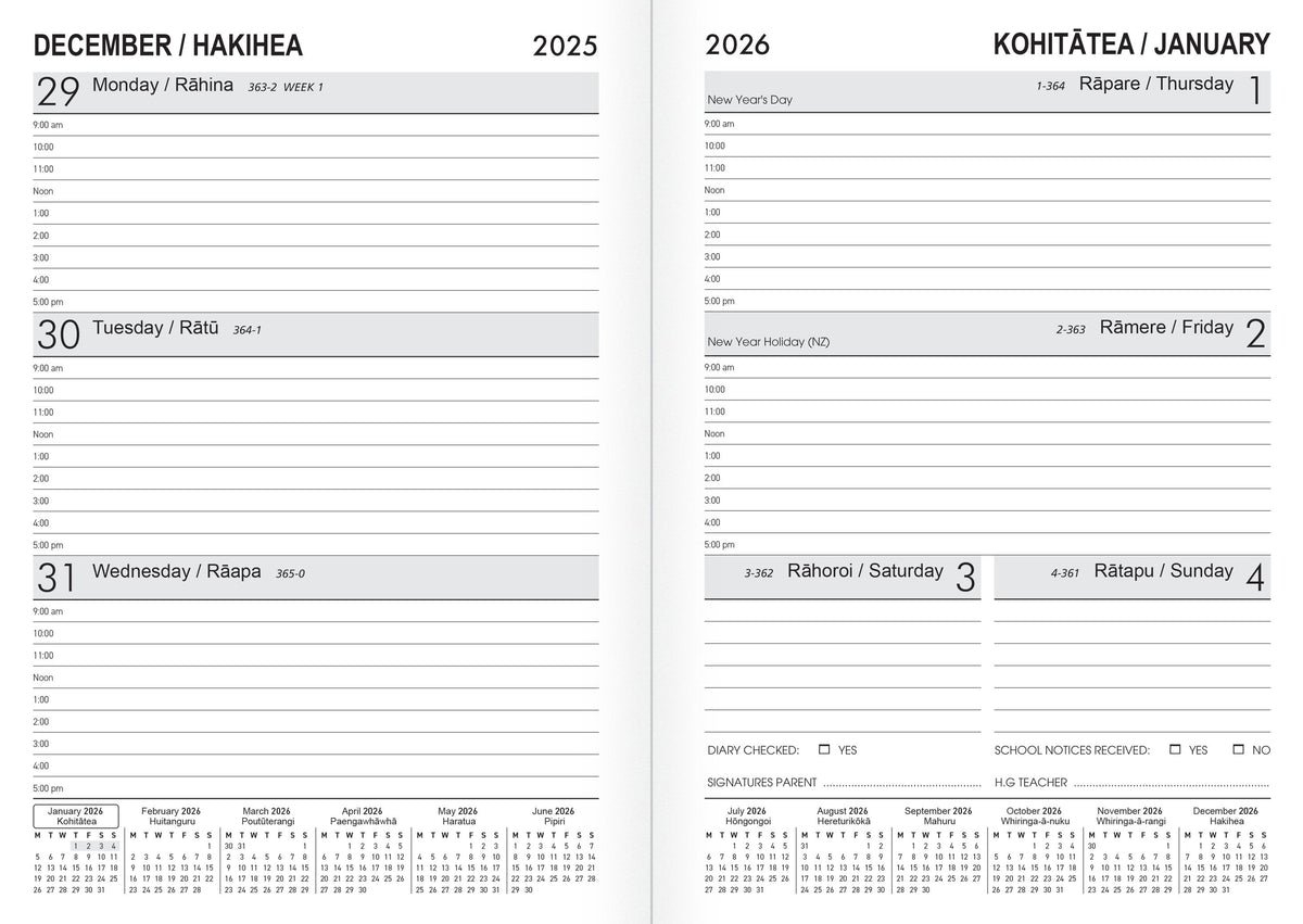 Student Spiral: Week to view. School timetable, sports/activities, assignments. Spiral bound, flexible, polyprop with laminated cover behind. Student Casebound: Week to view. School timetable, sports/activities, assignments. Flexible, printed board cover.