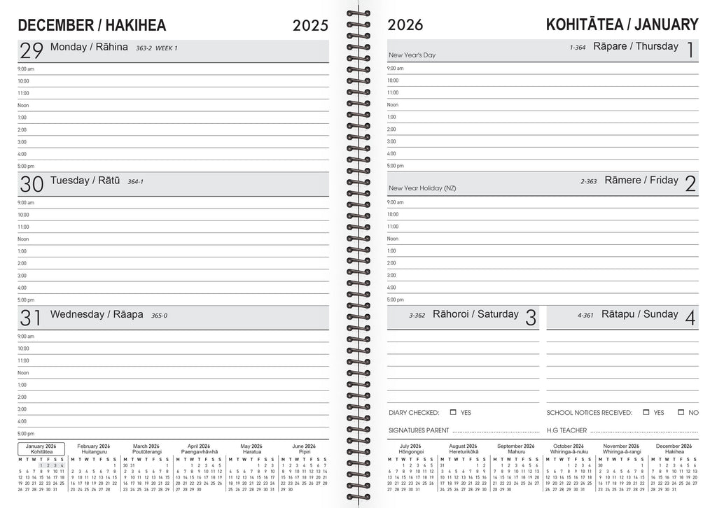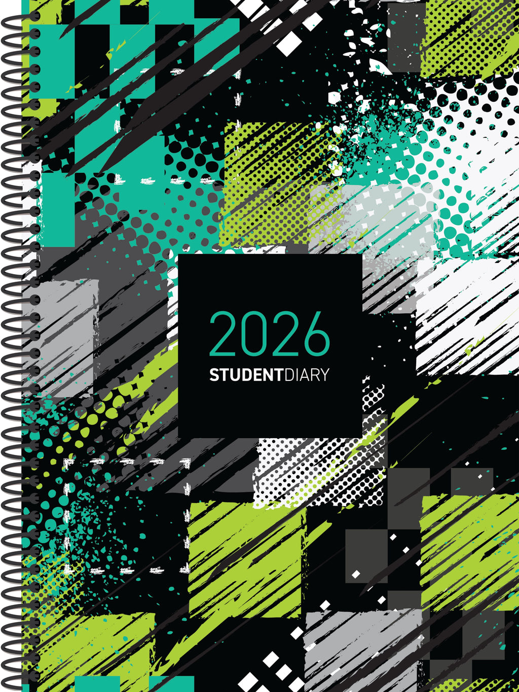 Student Spiral: Week to view. School timetable, sports/activities, assignments. Spiral bound, flexible, polyprop with laminated cover behind. Student Casebound: Week to view. School timetable, sports/activities, assignments. Flexible, printed board cover.