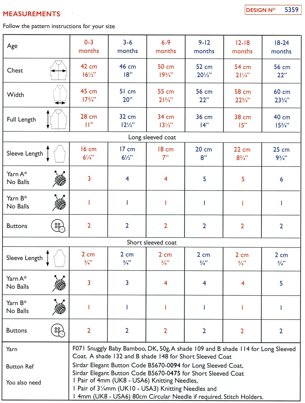 This pretty v-neck coat duo was designed for the Snuggly Baby Bamboo DK yarn by Sirdar or the Angel Bamboo 8ply yarn by DMC. The garments feature set-in sleeves and striped chevron lace details at the body. After being knit flat from the bottom up to the armholes as one piece, the stocking stitch chest is worked into 3 separate sections. The sleeves are then worked cuff upwards, and both garments are seamed together. The garter stitch neck and front borders are then added before the buttons are sewn in.