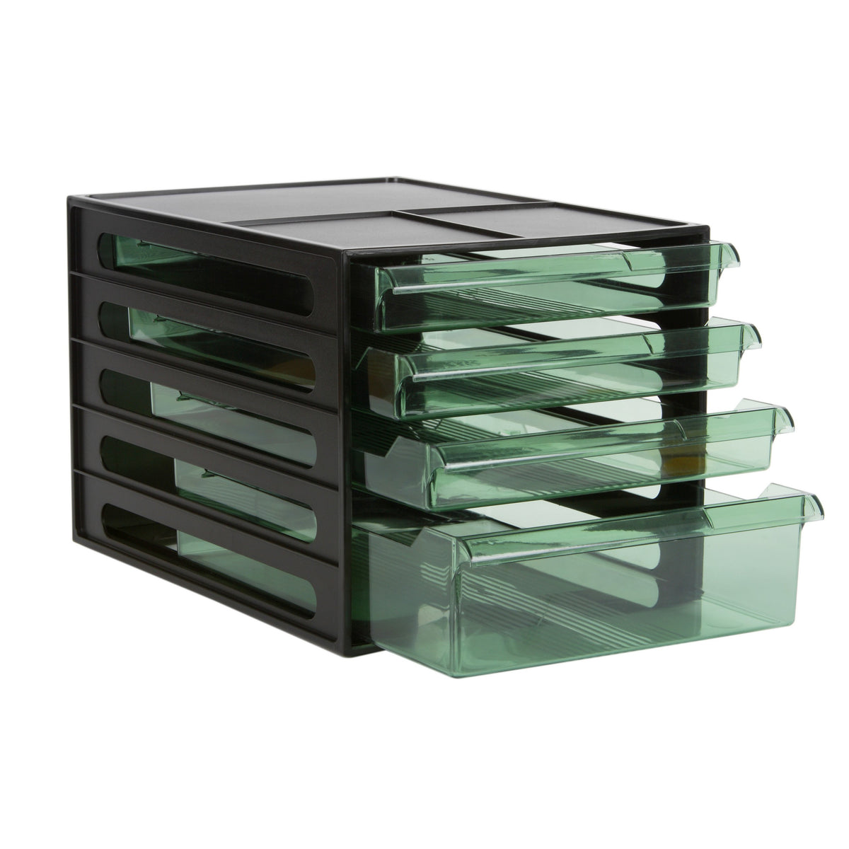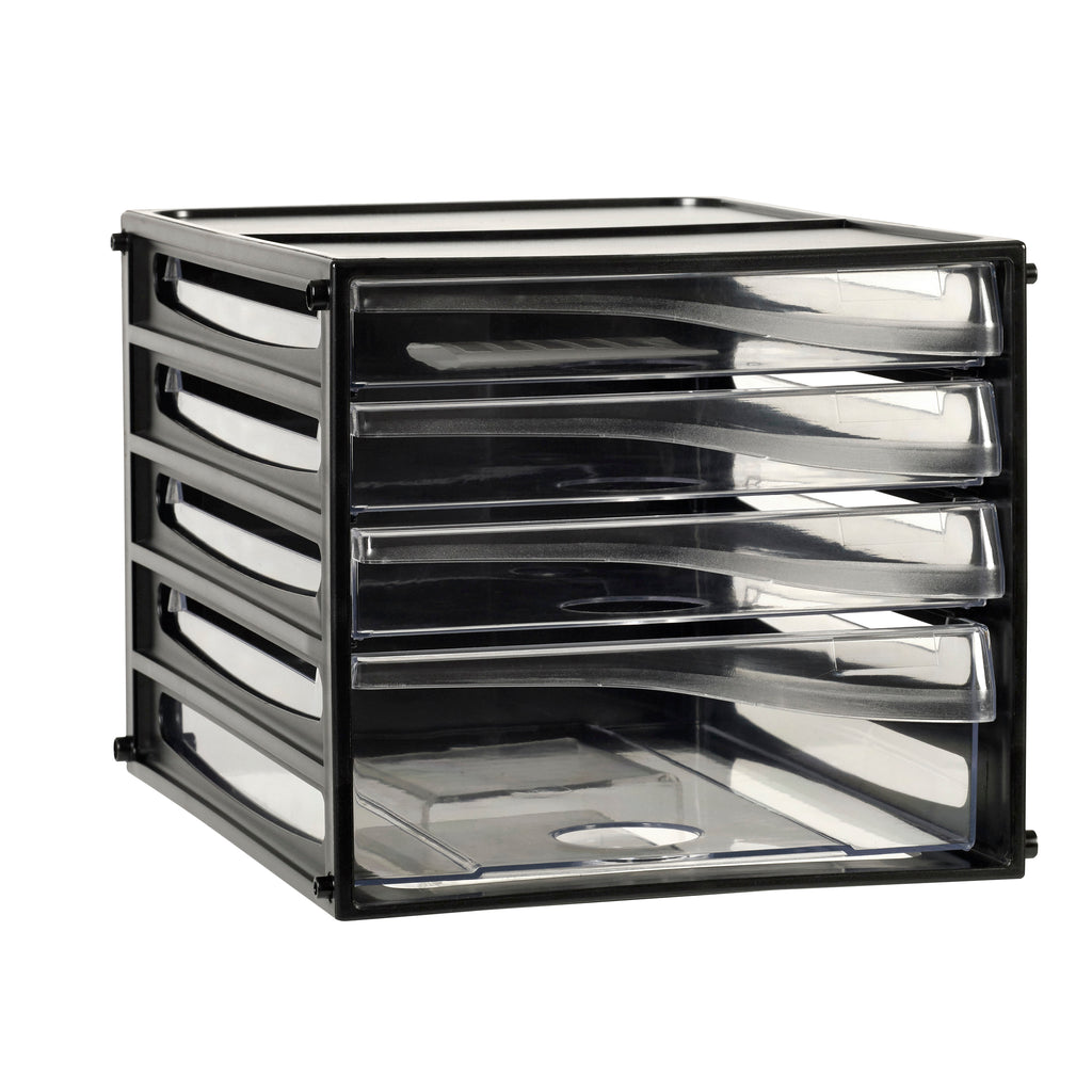 Desktop 4 drawer storage filing cabinet incorporating 3 standard drawers and 1 large double capacity drawer.