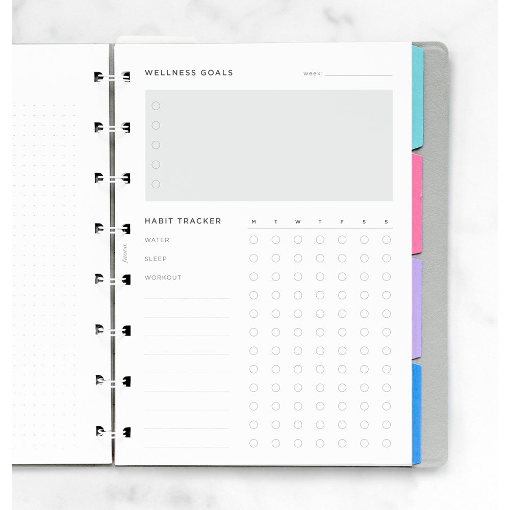With space for workouts, wellness goals and tracking habits, these pages were designed to help you take care of your body and soul. Compatible with your A5 Filofax Refillable Notebook. 56 sheets.