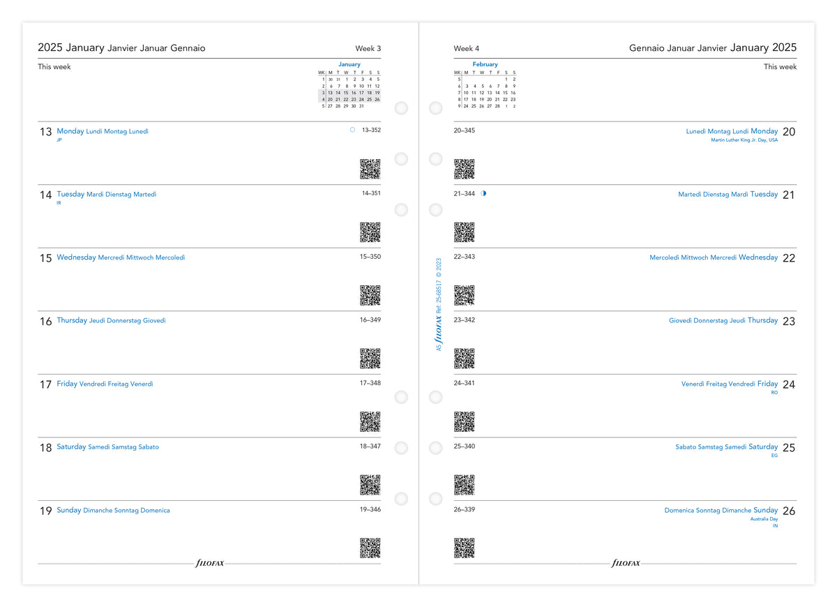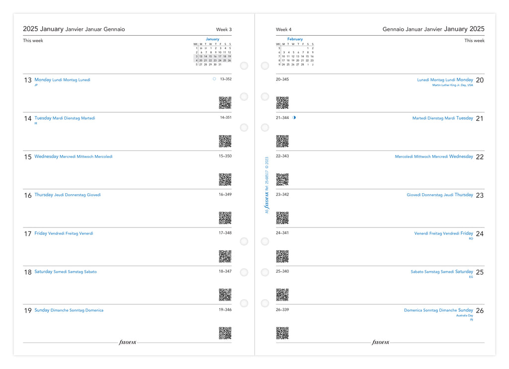 Organise two weeks at a glance with this A5 week on one page diary. Multi language: English, French, German & Italian. 80 gsm fountain pen friendly paper. Compatible with Filofax A5 size Organisers & Clipbook.