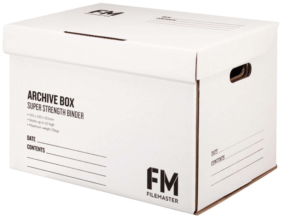This FM binder archive storage box file is designed to hold 5 A4 lever arch files or 4 foolscap sized storage cartons. It has triple strength side walls and a solid base that provides secure stacking up to 10 high. Box has a hinged lid and is white on outside and kraft on the inner.