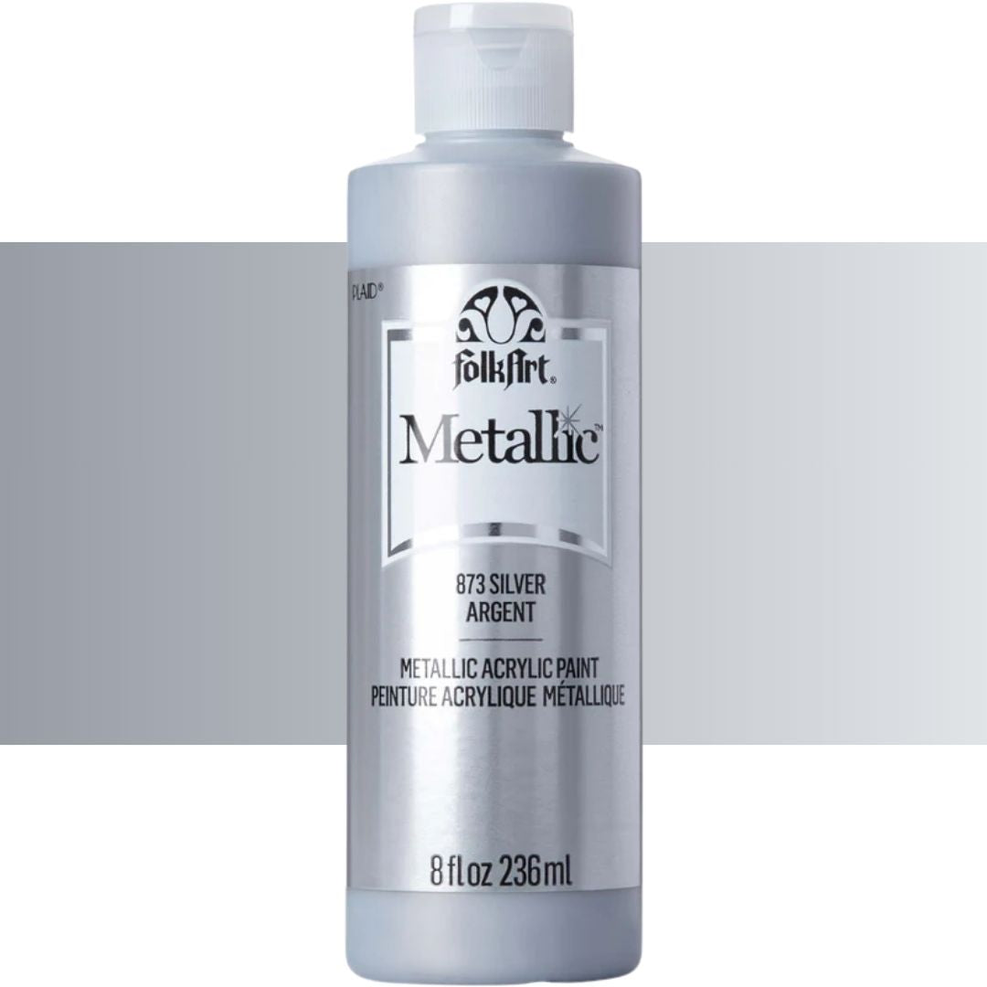 Add some shimmer to your next diy project with FolkArt metallic acrylic paint. This acrylic paint has a creamy and shiny consistency that brushes on smooth leaving a beautiful metallic finish.