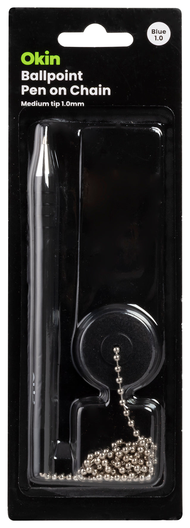 Okin ballpoint pen on chain. Non-skid metal tip for smooth writing and a 580mm chain length. Premium ink for consistent and high-density lines. 1.0mm medium tip. Blue ink. Refillable with PENCHAIN-R Icon Ballpoint Pen on Chain Refill.
