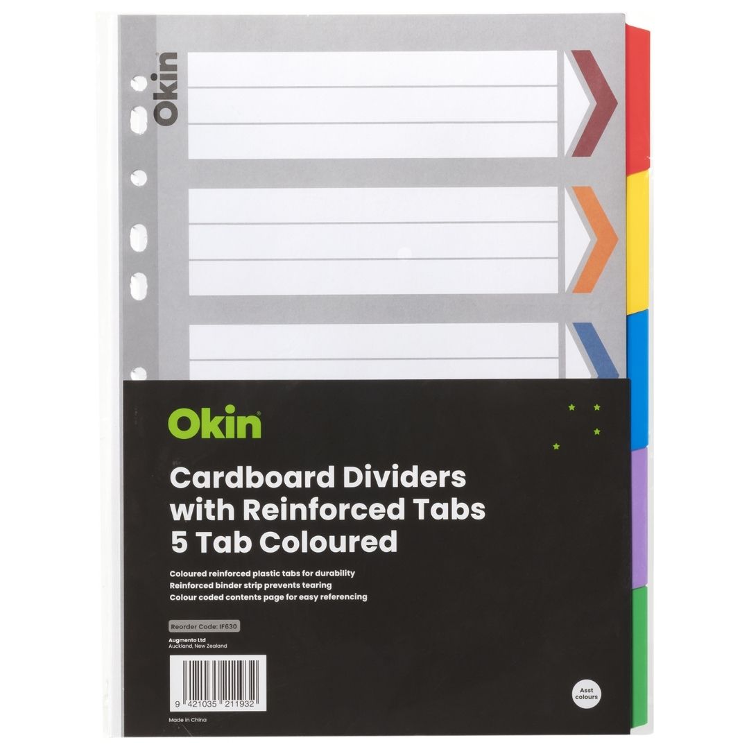 Okin Cardboard Dividers are great for organising and colour coding work and projects. Dividers with reinforced plastic tabs, designed for heavy duty use. Multi punched reinforced spine for use with all ring binders. Comes with a seperate colour coded contents page for easy referencing.