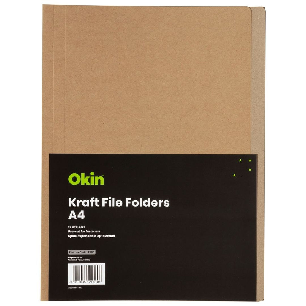 Okin Kraft File Folders are ideal for general purpose filing. These quality folders feature a shorter front cover to enable easy opening. The back panel contains 2 slots for paper fasteners. Expandable spine for 20mm capacity.