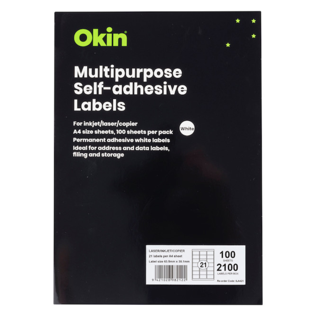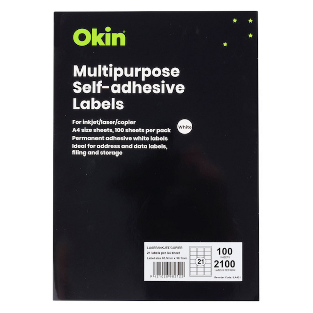 Okin Multipurpose Self-Adhesive Labels for inkjet, laser and copier. Permanent adhesive white labels are ideal for address and data labels, filing and storage. 21 labels per sheet, 63.5mm x 38.1mm. 100 sheets per pack.