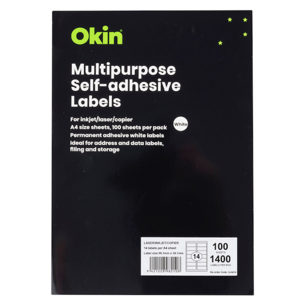 Okin Multipurpose Self-Adhesive Labels for inkjet, laser and copier. Permanent adhesive white labels are ideal for address and data labels, filing and storage. 14 labels per sheet, 99.1mm x 38.1mm. 100 sheets per pack.