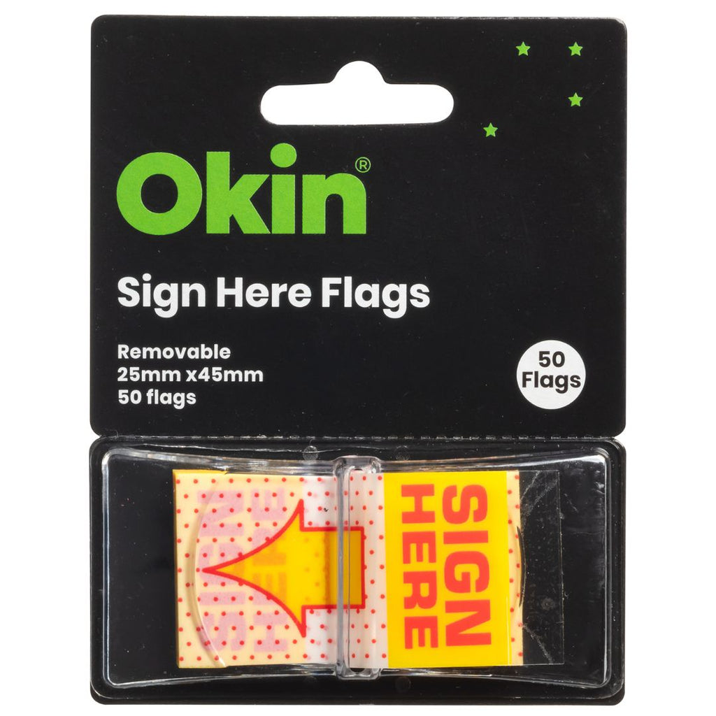Okin Flags are ideal for marking or highlighting pages with important information. These self-adhesive flags can be repositioned, reused and can also be written on! The pop-up dispenser keeps flags always within reach. 25x45mm size. Pack of 50 Sign Here flags.