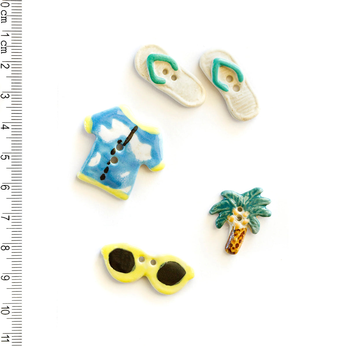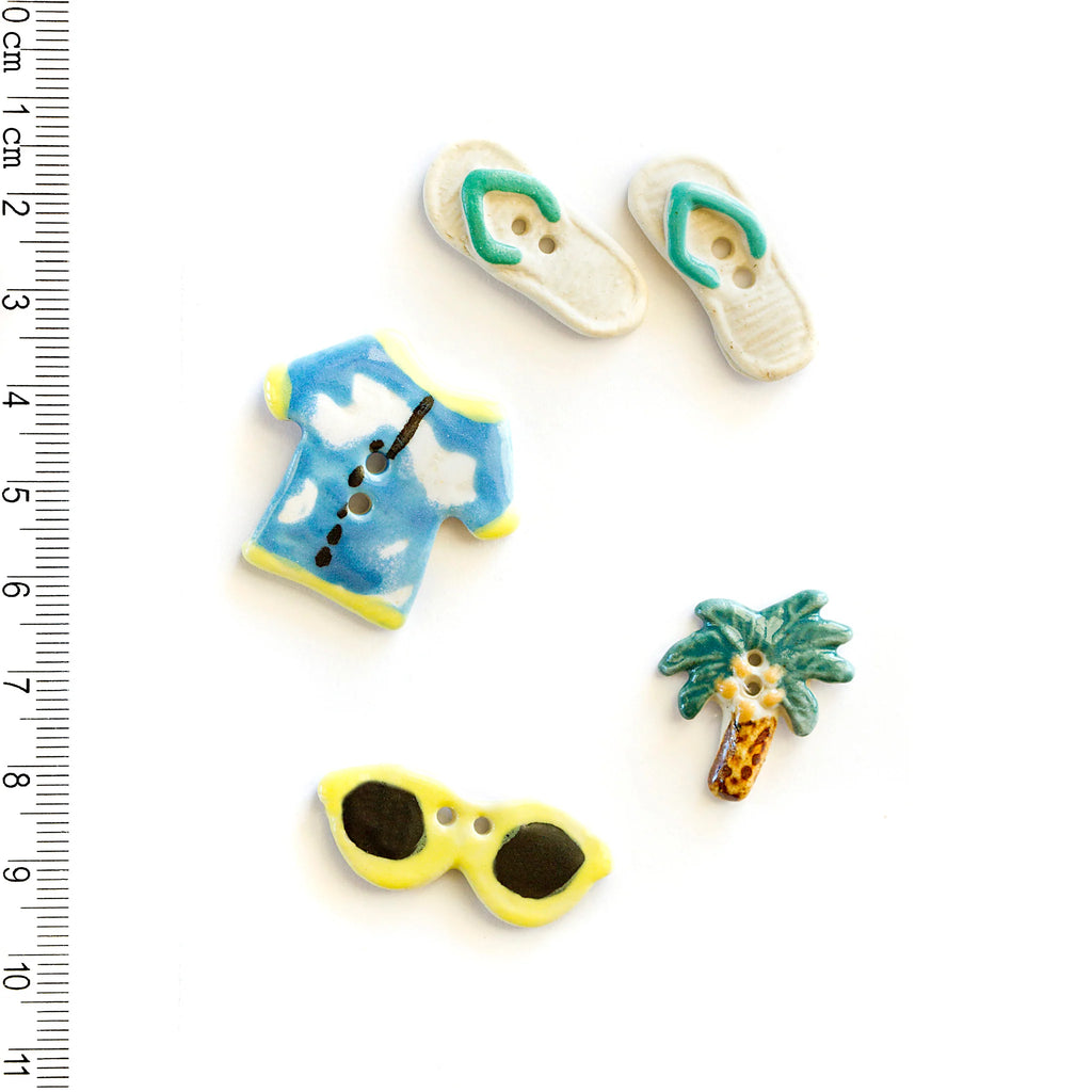 5 Island style buttons (2 flip flops, island shirt, palm tree and sunglasses).