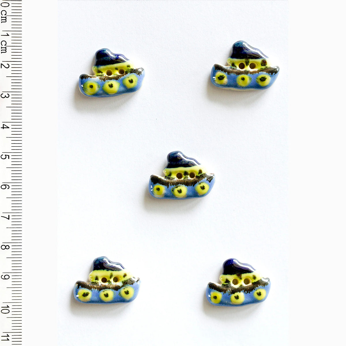 Each button is carefully hand crafted from Incomparable Buttons' unique mixture of ceramic and stoneware clay, and hand painted with an assortment of glazes. Each and every one of the buttons is lovingly made and then painted by hand with a paintbrush, no transfers and no quick tricks. From the tortoise's smile to the cat's whiskers, every stroke is made by hand and each piece is unique.