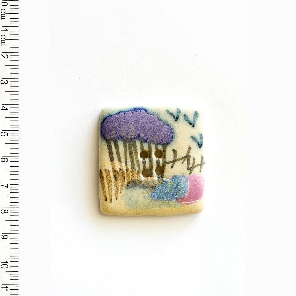 1 X-large square statement button. A beautiful hand-painted country scene including birds, trees, country fence and lake on an extra large square button.