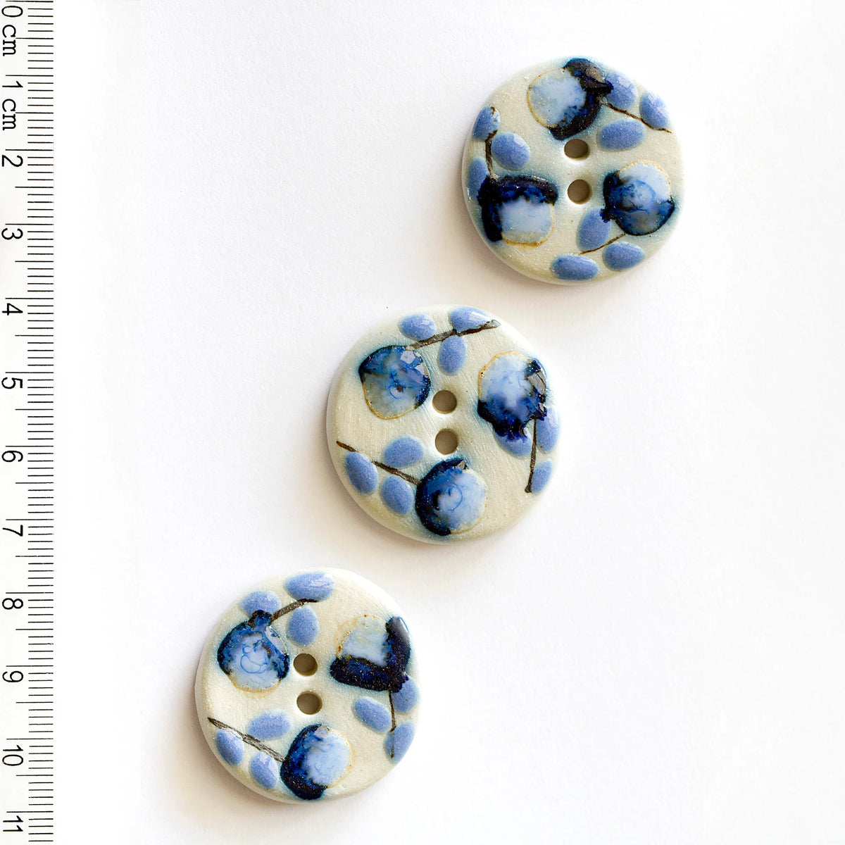 Each button is carefully hand crafted from Incomparable Buttons' unique mixture of ceramic and stoneware clay, and hand painted with an assortment of glazes. Each and every one of the buttons is lovingly made and then painted by hand with a paintbrush, no transfers and no quick tricks. From the tortoise's smile to the cat's whiskers, every stroke is made by hand and each piece is unique.