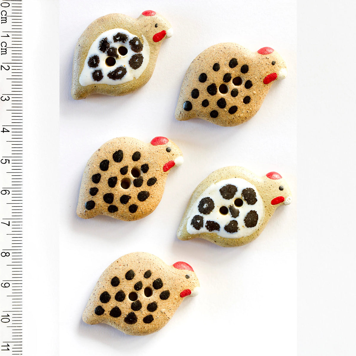 Each button is carefully hand crafted from Incomparable Buttons' unique mixture of ceramic and stoneware clay, and hand painted with an assortment of glazes. Each and every one of the buttons is lovingly made and then painted by hand with a paintbrush, no transfers and no quick tricks. From the tortoise's smile to the cat's whiskers, every stroke is made by hand and each piece is unique.