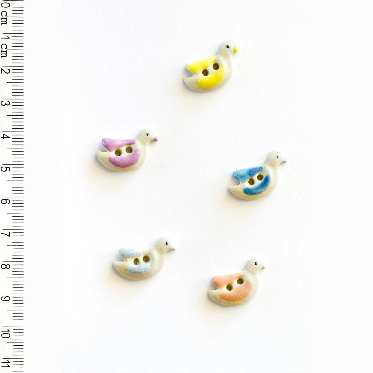 5 small bird buttons in a variety of pastel colours (yellow, lilac, pink, blue, light blue).