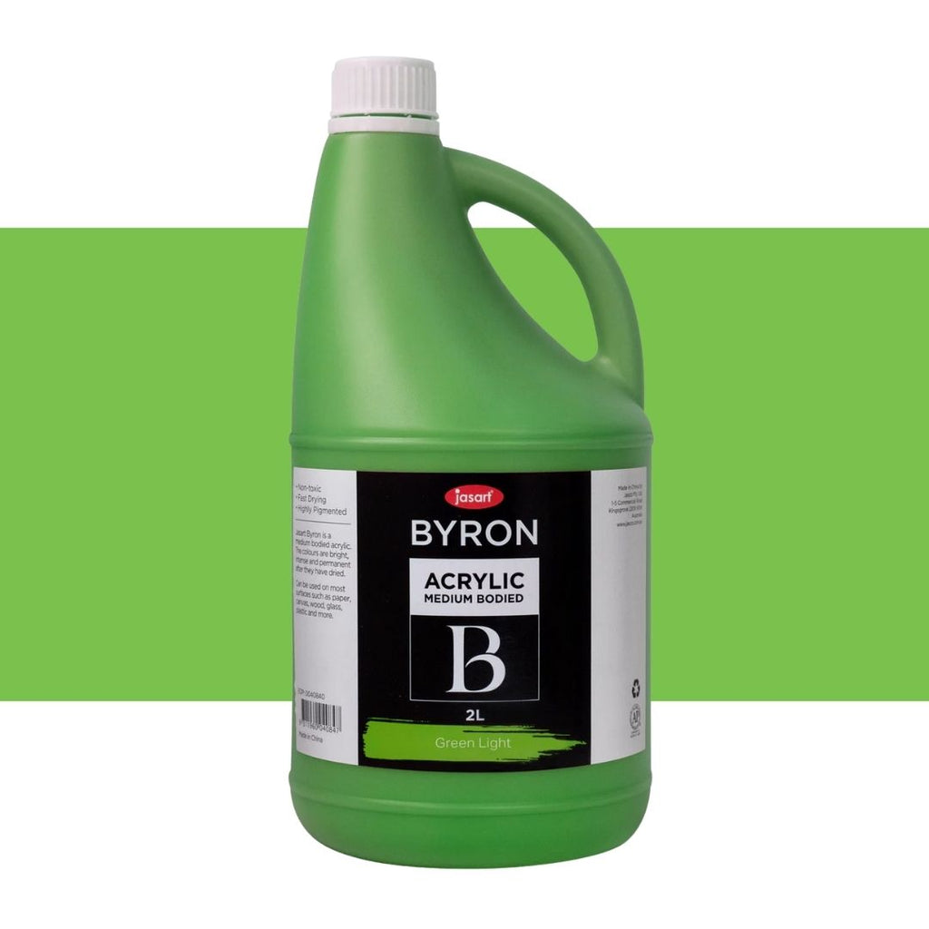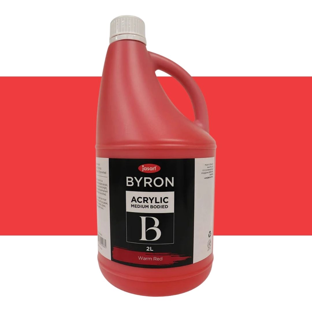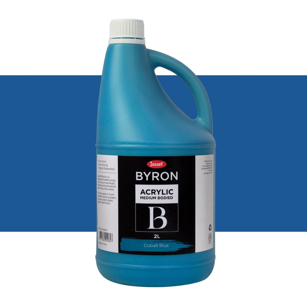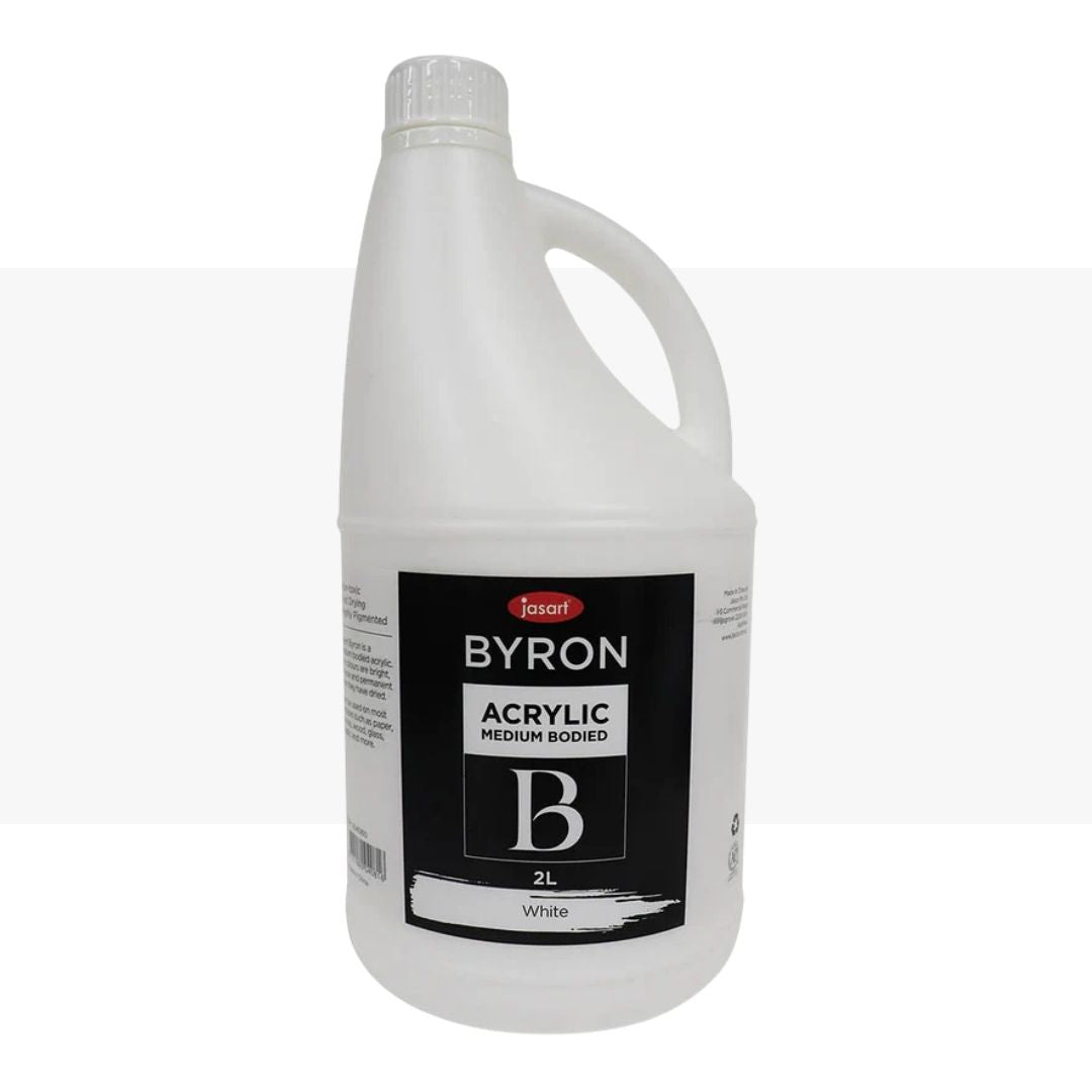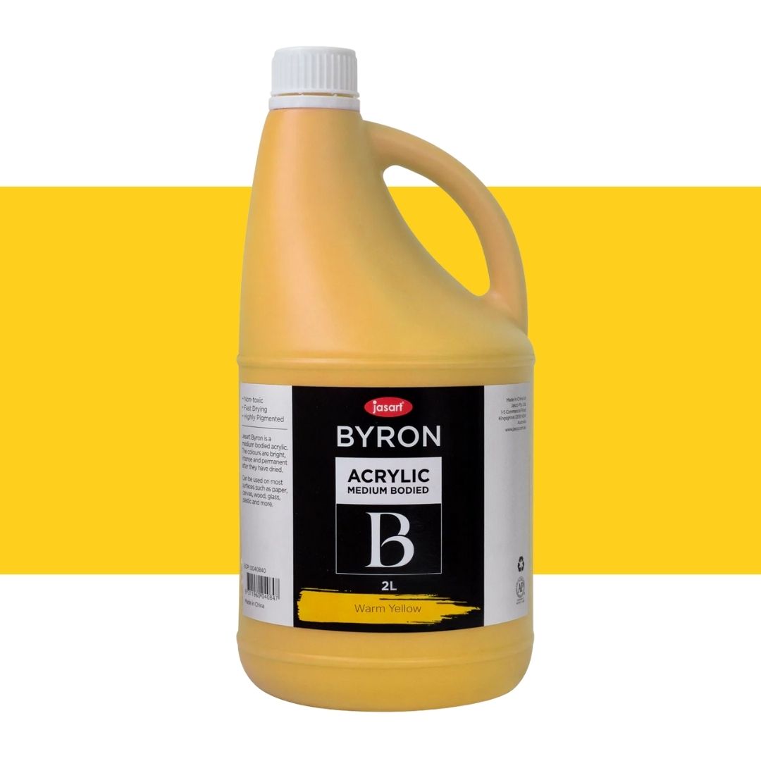 Jasart byron is a medium-bodied acrylic. The colours are bright, intense and permanent after they have dried. Can be used on most surfaces such as paper, canvas, wood, glass, plastic and more. Warm and cool primary colours will allow you to have superior colour mixing. Non toxic. 2L bottles are available in 18 colours.