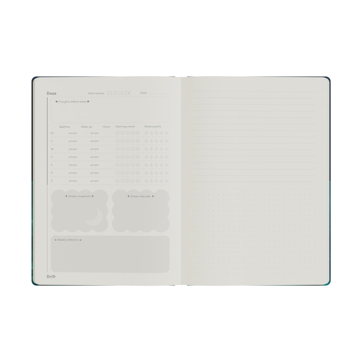 Right Side: A versatile notes page with top ruled lines for "brain-dumping" tomorrow's to-do list (so you don't stay awake thinking about it) and a bottom dot grid for dream journaling or relaxing doodles.