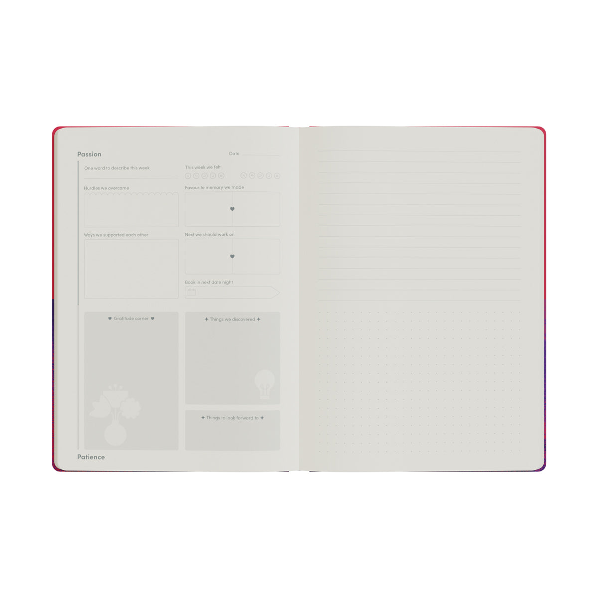 Right Side: A unique notes page with top ruled lines for shared goal-setting or memory-keeping, and a bottom dot grid for "free-flow" sketches, photo placement, or brainstorming.