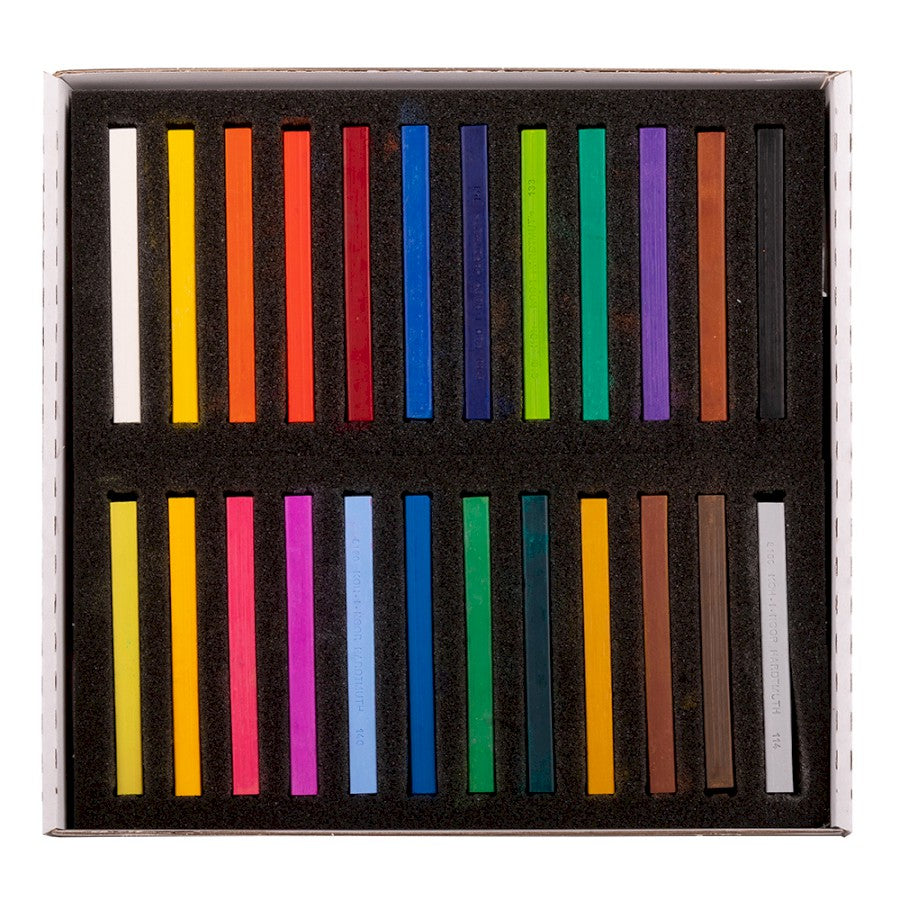 Sets of square hard artistic pastels, size 7 x 7 x 75 mm, packed in a cardboard box. Pastels are suitable for artistic and hobby drawing. Strongly pigmented with high light fastness and smooth track.
