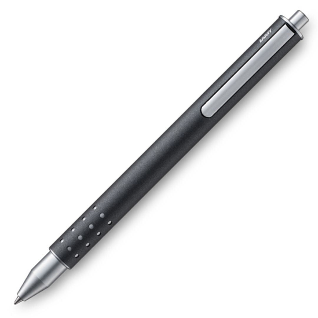 The eye-catching Lamy Swift is a capless rollerball. It writes fluidly and has a special mechanism that allows the ink refill to recess inside the pen protecting the ink from drying out. The metal clip is very clever, it moves out of the casing when not in use and is flush with the rollerball when in use.