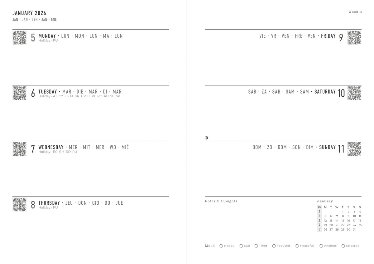 Letts of London Diary Conscious A5 Week to View. Live an organised life with a touch of nature! Our Conscious Collection now features new, nature-inspired drawing from the serene beauty of mountains and lakes. Crafted with sustainability in mind, these rich colours bring a grounded elegance to your planning, perfect for those who care about both style and the planet.