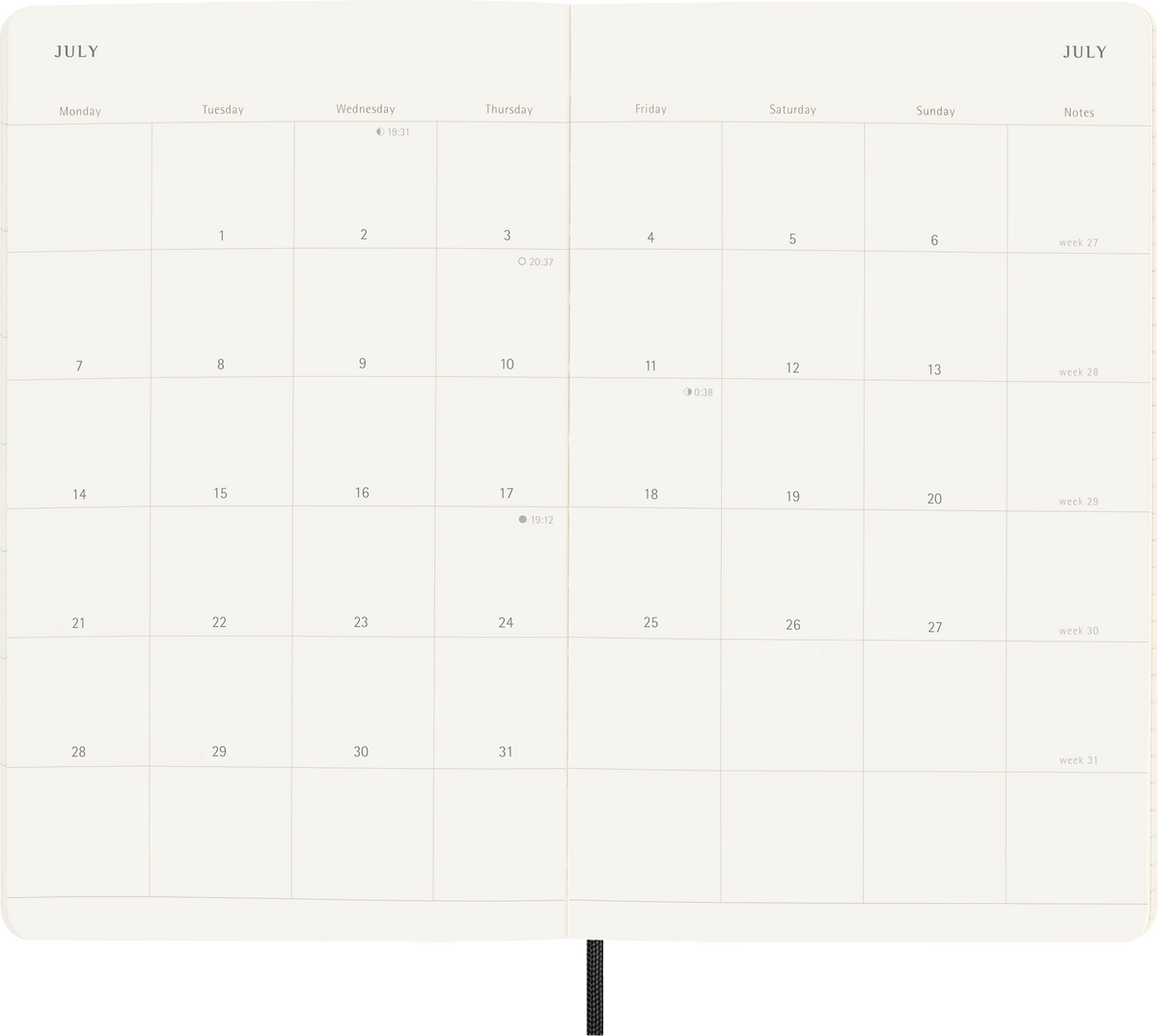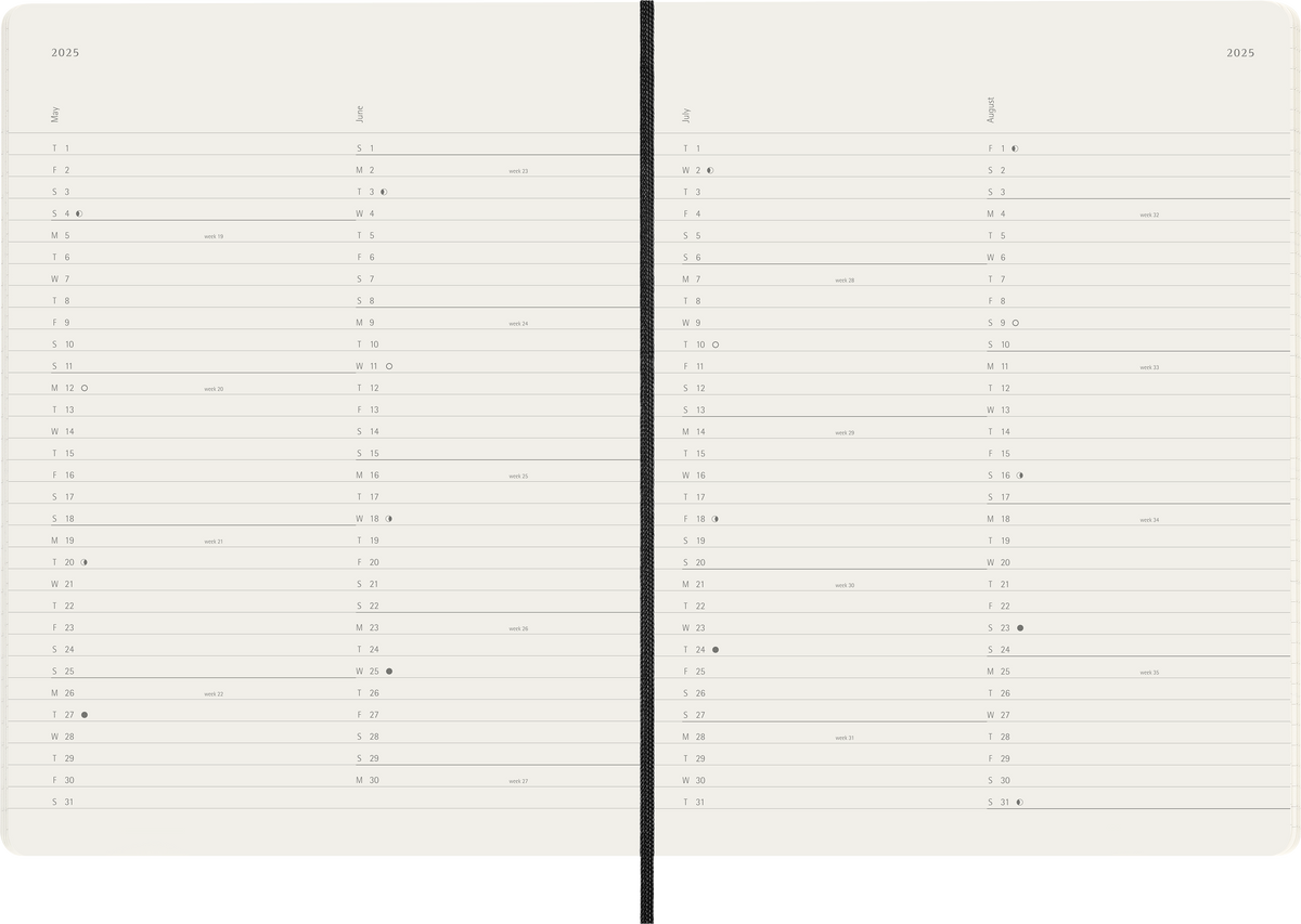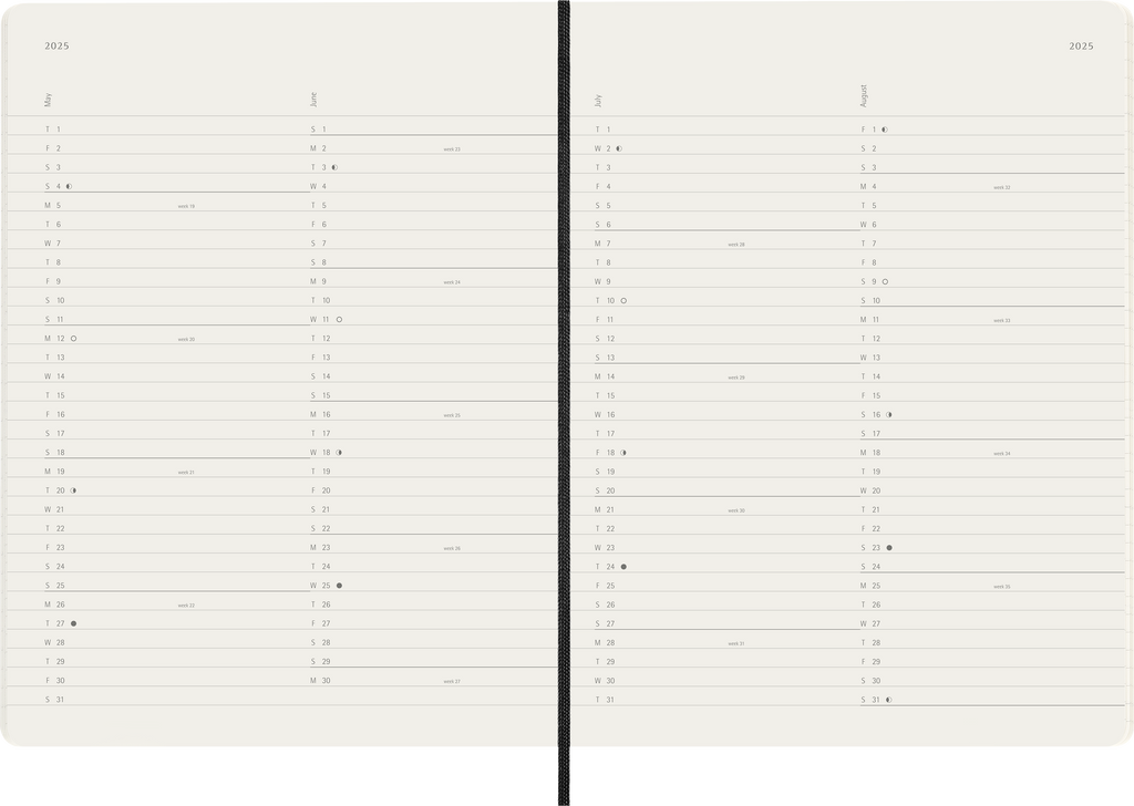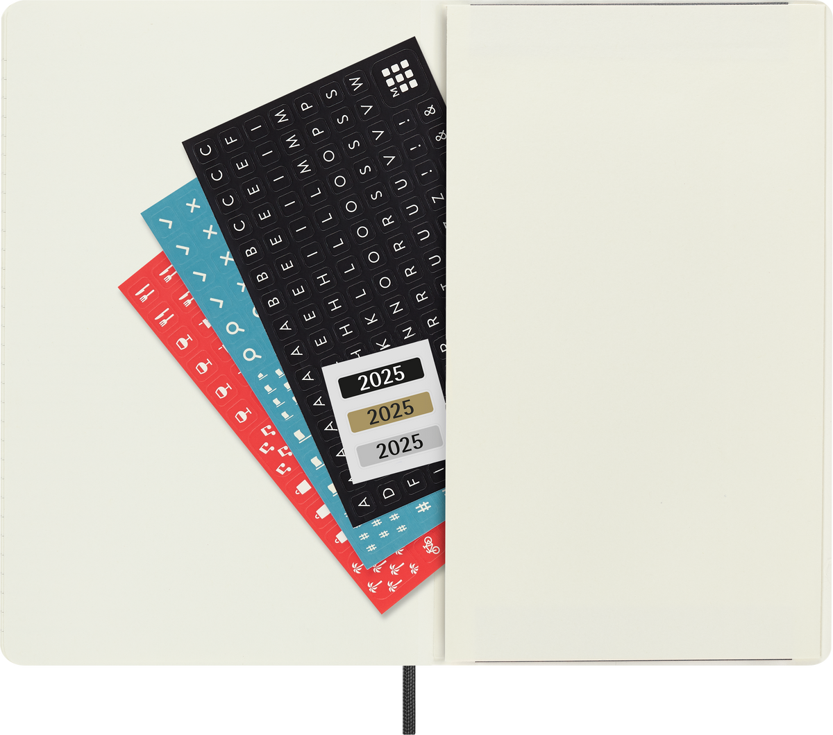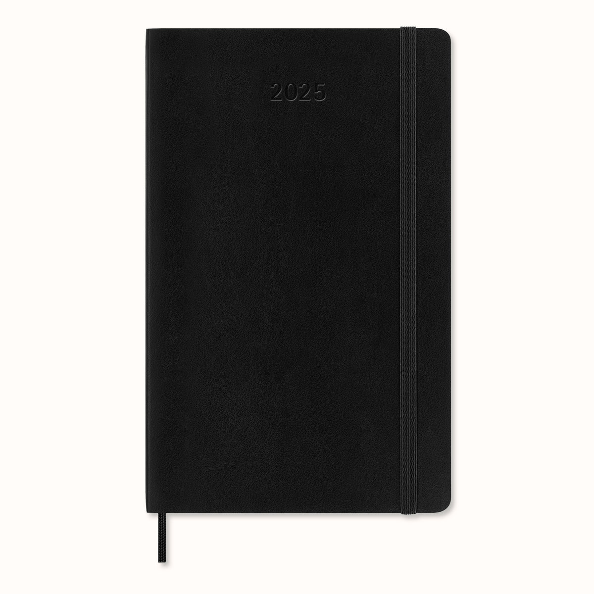 The Moleskine Soft Cover Large Monthly Diary is dated from January to December. This planner shows each month across a two-page spread, followed by a double ruled page between each month for note-taking. 51 ruled pages are included at the end, offering extra space for organizing and planning the year. The perfect combination of freedom and organization. Features: elastic closure, expandable inner pocket, matching ribbon bookmark, Ivory-colored 70 gsm acid-free paper.